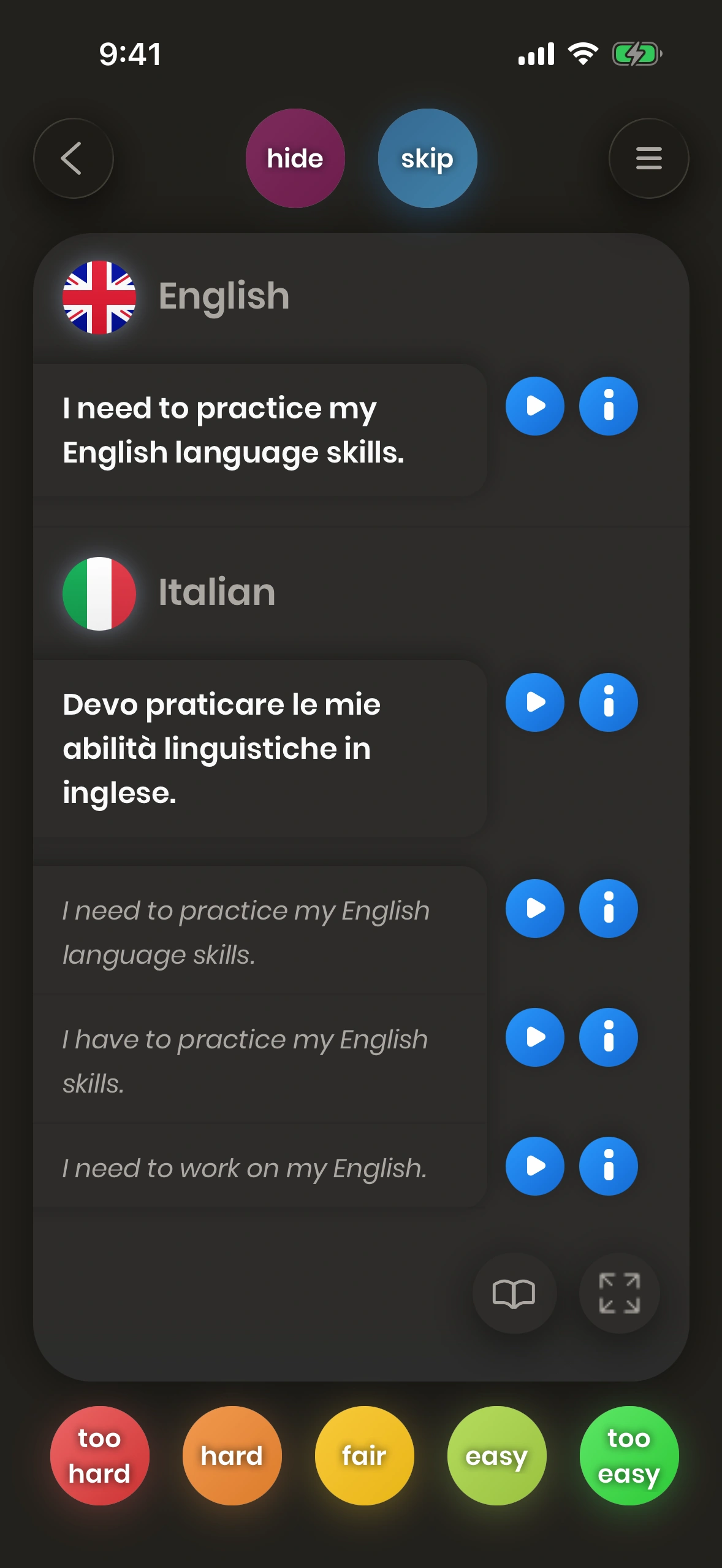Look at a card. Try to translate the word or phrase. Turn the card. Tell us how difficult it was. Difficult words and phrases are shown again soon.