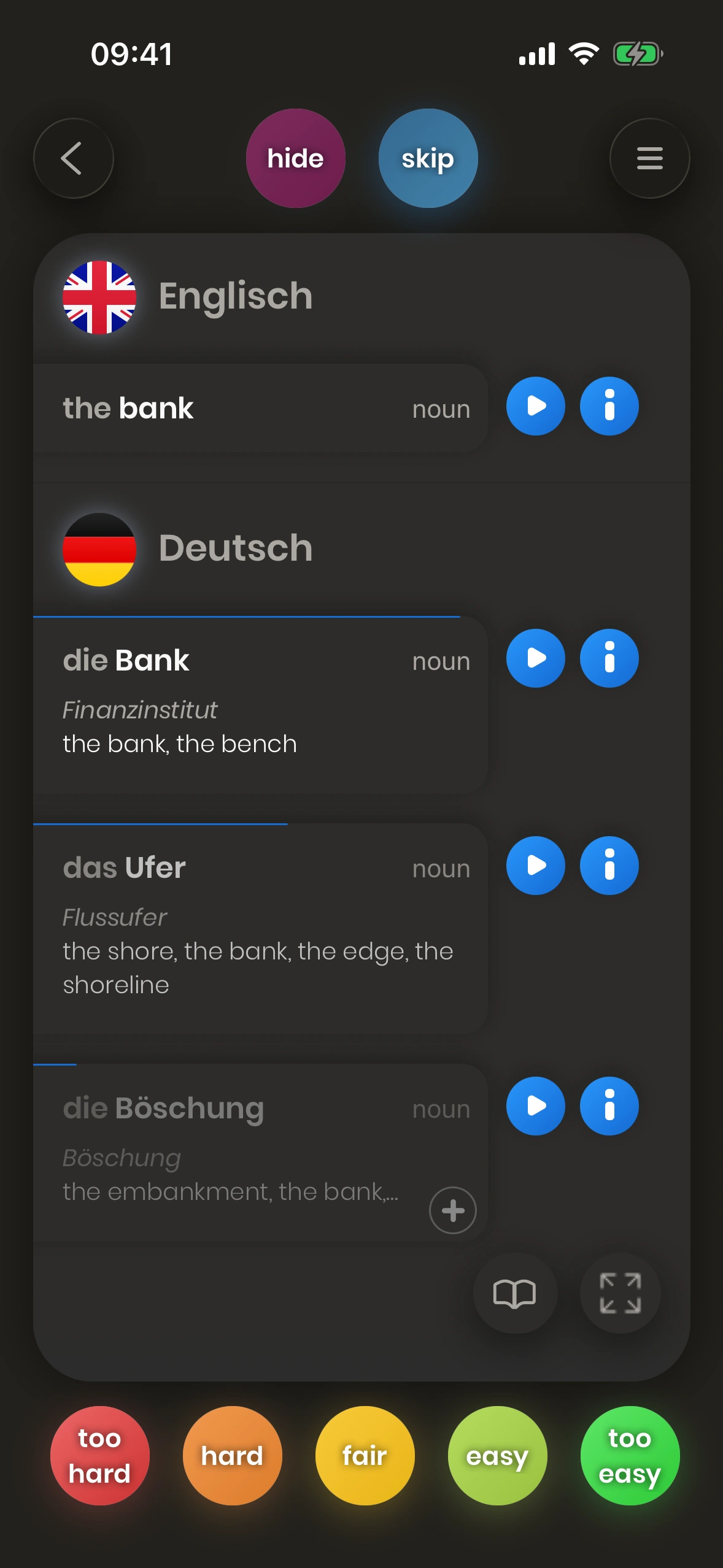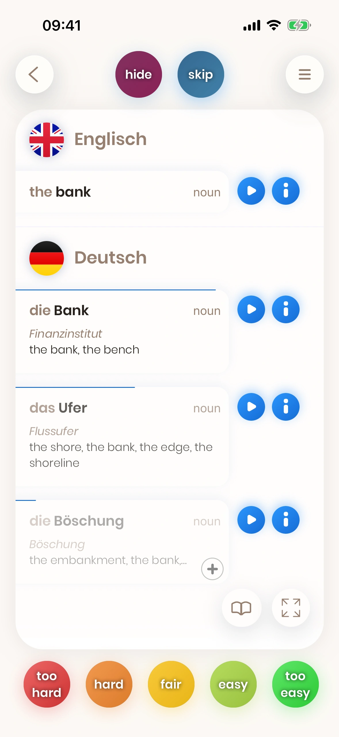 Du musst nicht alle kennen: Kannst du eine der ersten Übersetzungen nennen, gilt die Karte als „gelernt“. Mehr Details später.