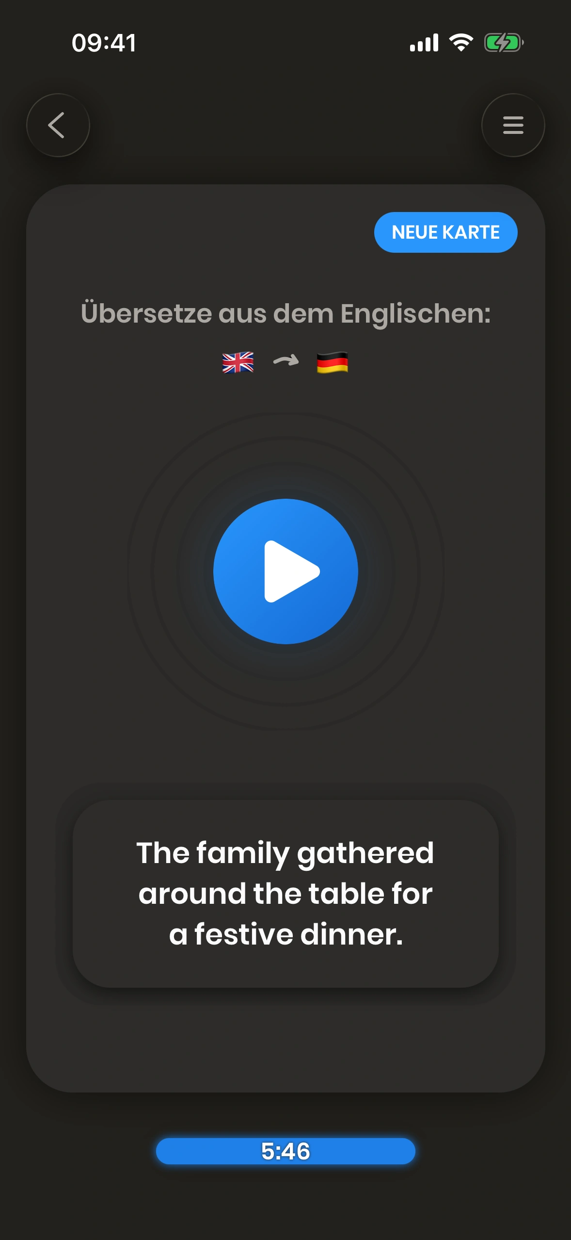 Die Vorderseite zeigt dir eine Aufgabe und kurze Anweisungen. Meist handelt es sich um ein Wort oder eine Phrase, die du übersetzen sollst.