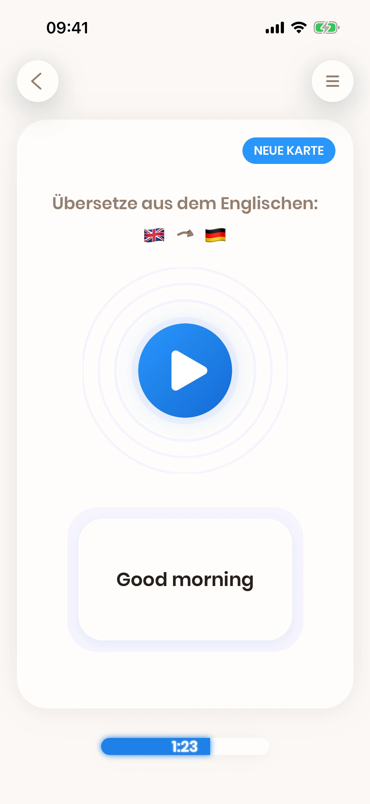 Daher wird die Zeitanzeige nach einigen Sekunden orange. Das signalisiert: Diese Karte öfter üben – z. B. durch hard oder too hard – und dann zur nächsten Karte.