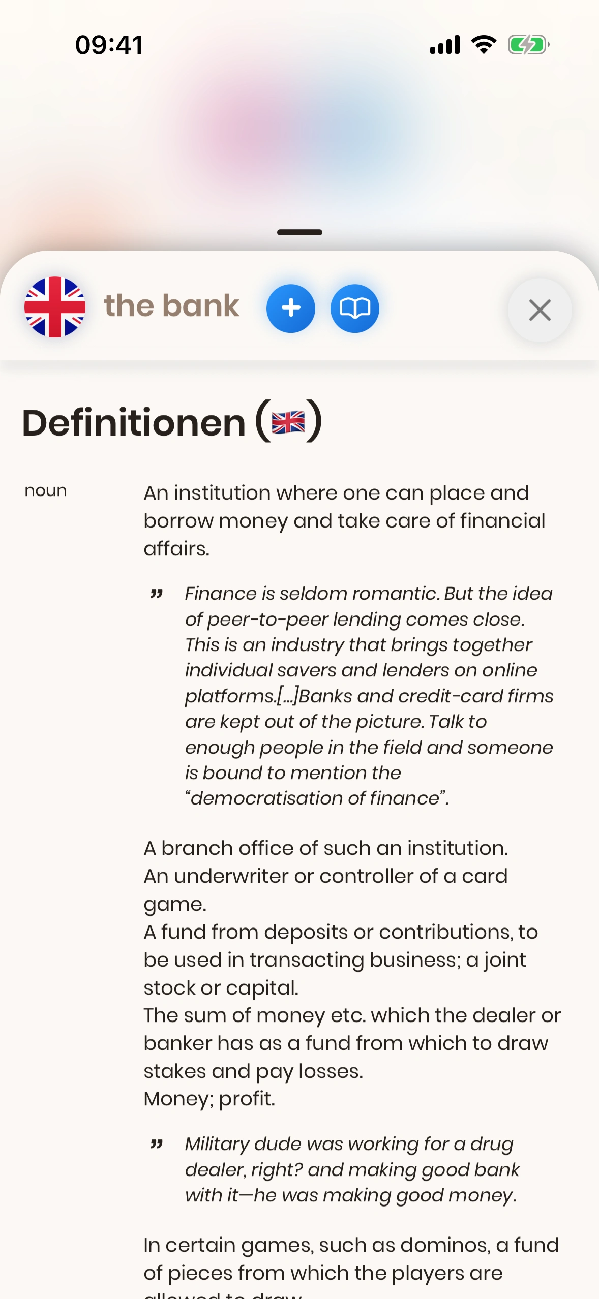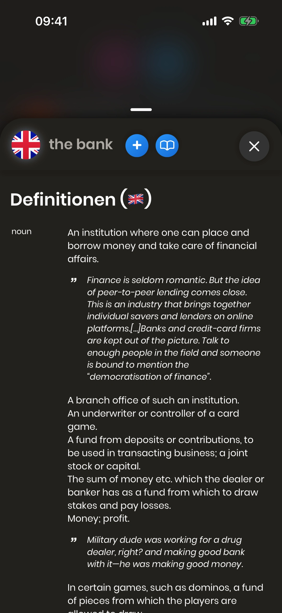 - Wort als Karte zur Lern‑Warteschlange hinzufügen (Wortkarte mit dem aktuellen Wort auf der Vorderseite).