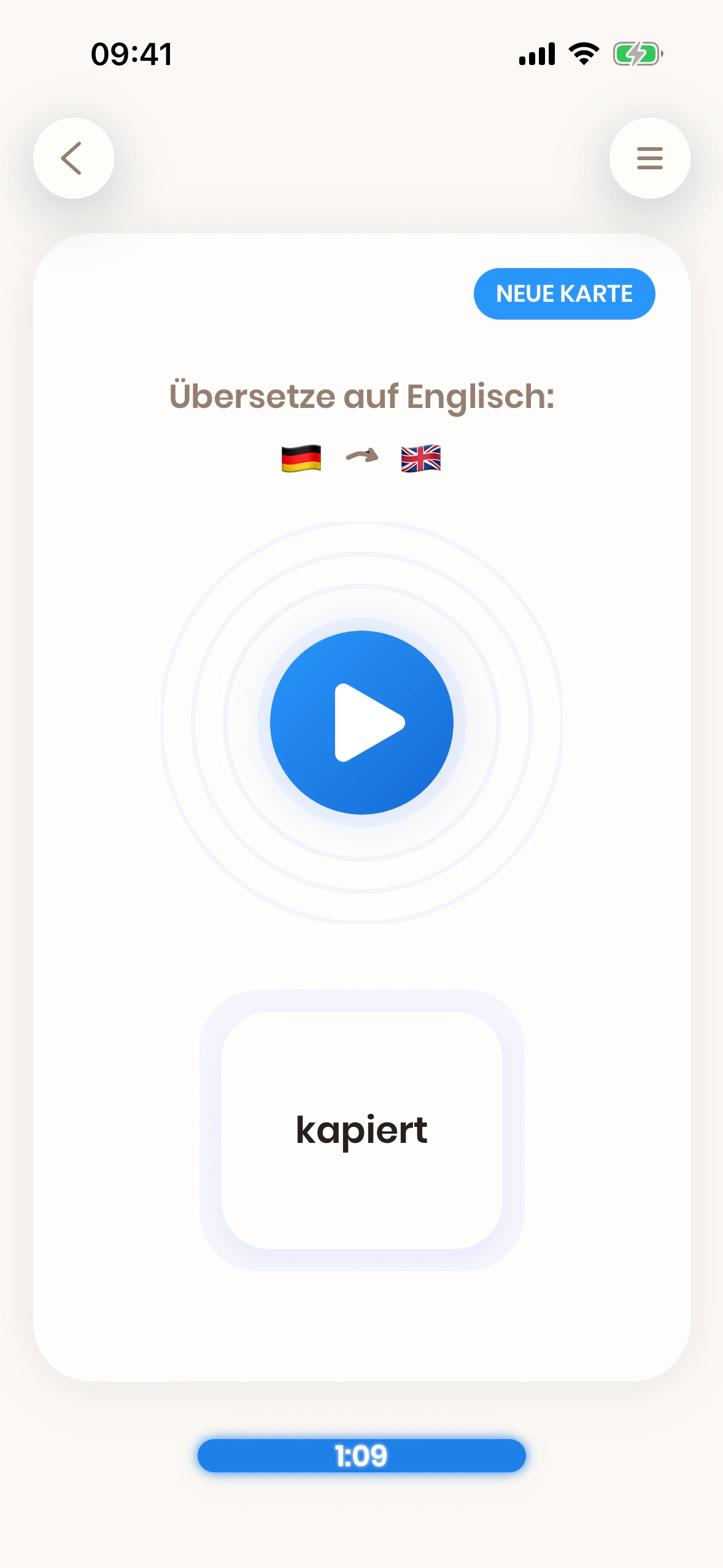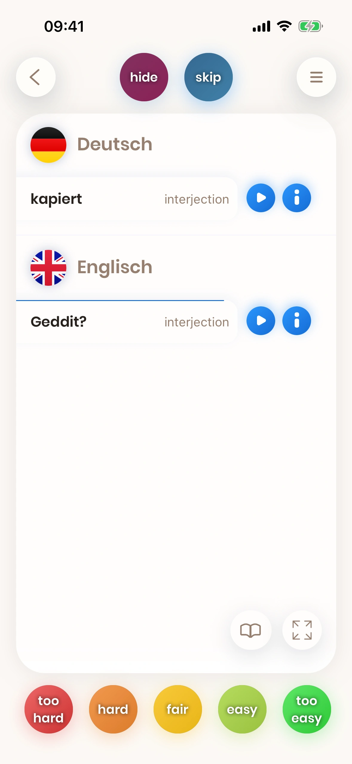 Wenn die Übersetzung eines Wortes oder einer Phrase für dich schwierig ist, dann musst du es öfter üben. Aus diesem Grund wird die Karte bald wieder gezeigt, wenn du einen roten Button wie too hard drückst, damit du das Wort oder die Phrase öfter üben kannst.