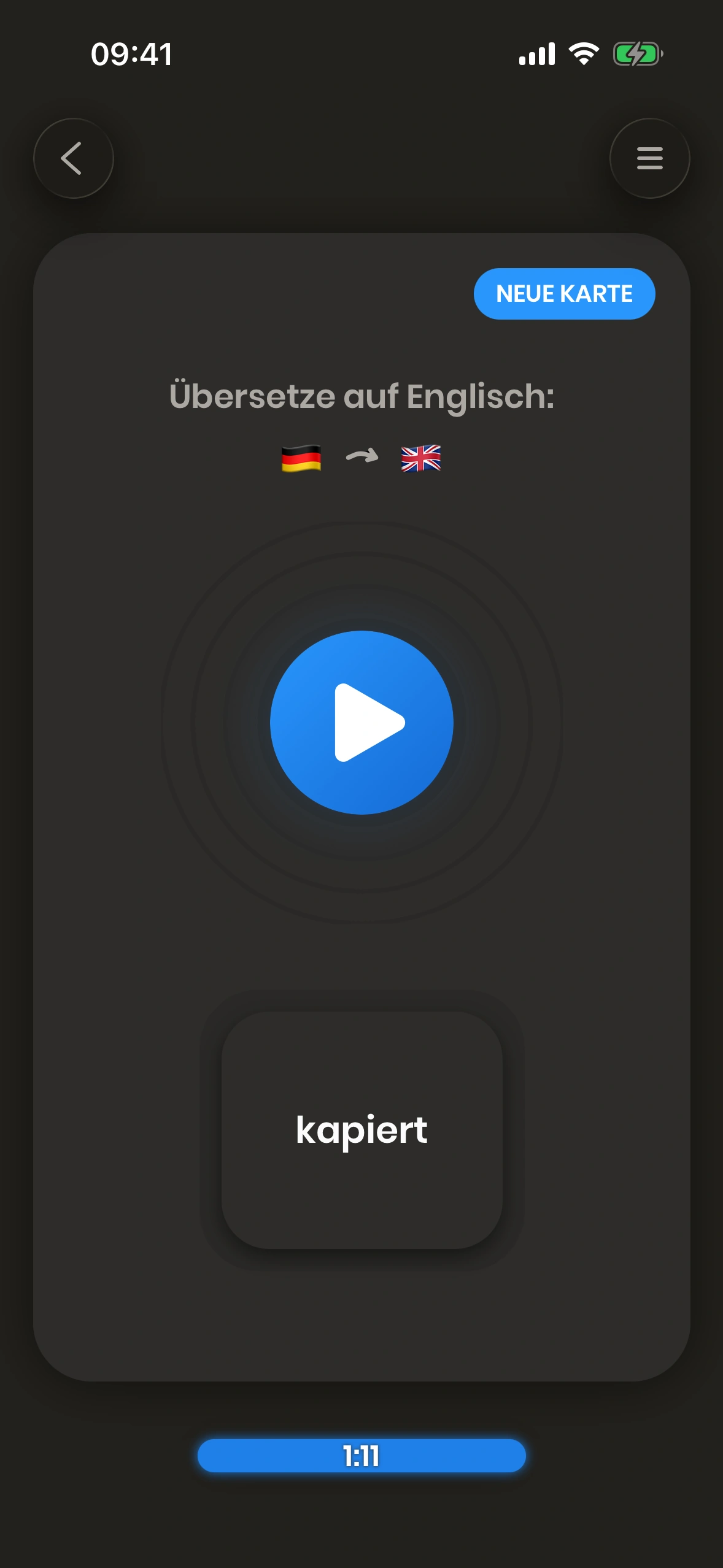 Just English ist eine Karteikarten-basierte App. Karteikarten sind Karten, die sowohl eine Vorder- als auch eine Rückseite haben. Du schaust dir die Vorderseite an und versuchst, das Wort (oder die Phrase) darauf zu übersetzen.