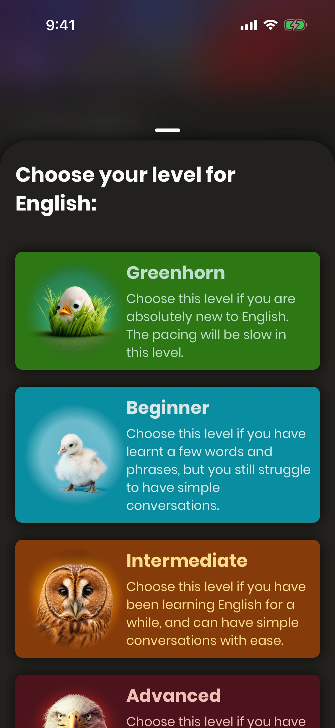 In the tutorial you do at the first startup of the app, Just English estimates your language ability and proposes a level for you. We recommend you to accept this level, but you can change it at any time.