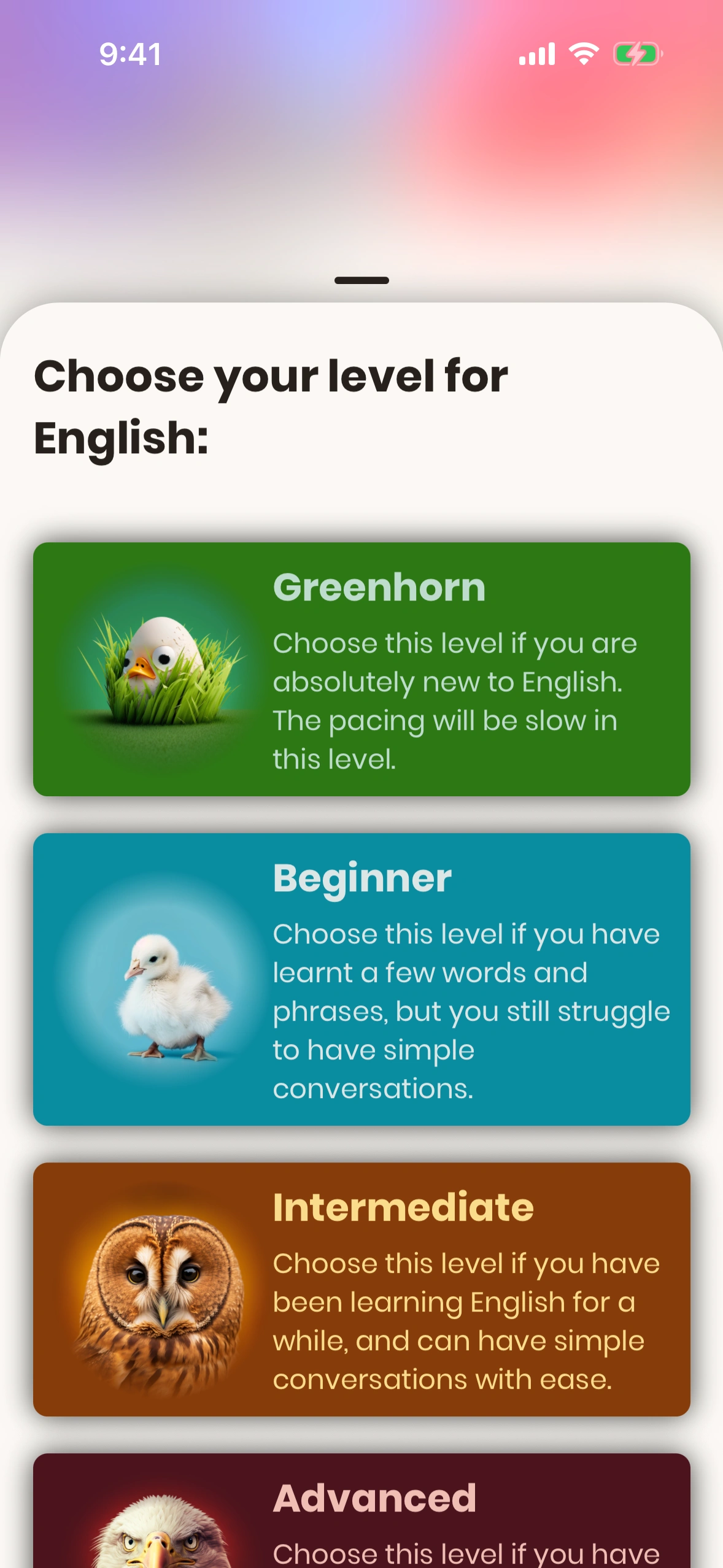 - If you are absolutely new to a language, then you are at level Greenhorn. This means you still need to learn very basic things like "Good evening!" or "What's your name?".