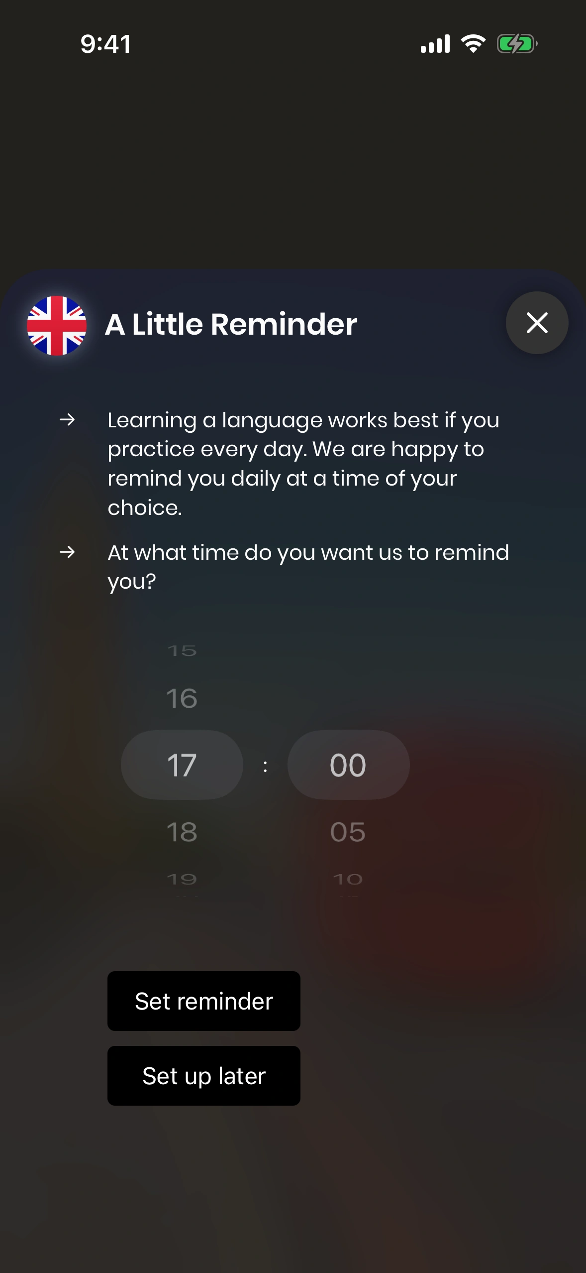 - With your day already busy with work, family, and friends, it's easy to forget your daily lesson. That's why Just English offers a daily reminder feature. You can enable it during the tutorial, as well as in the settings.