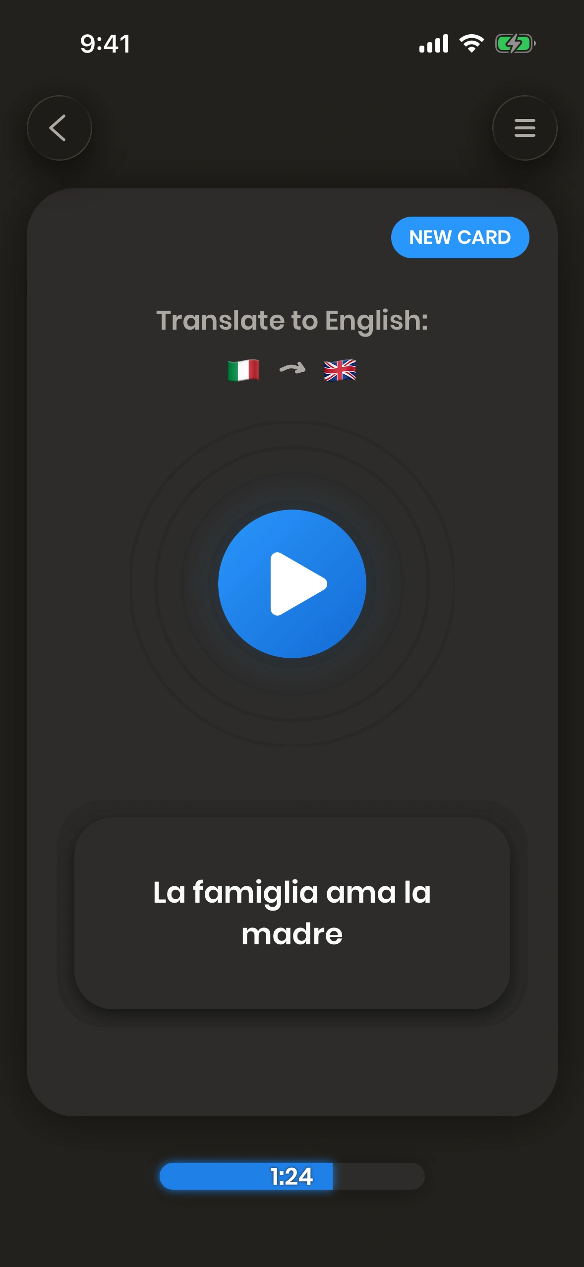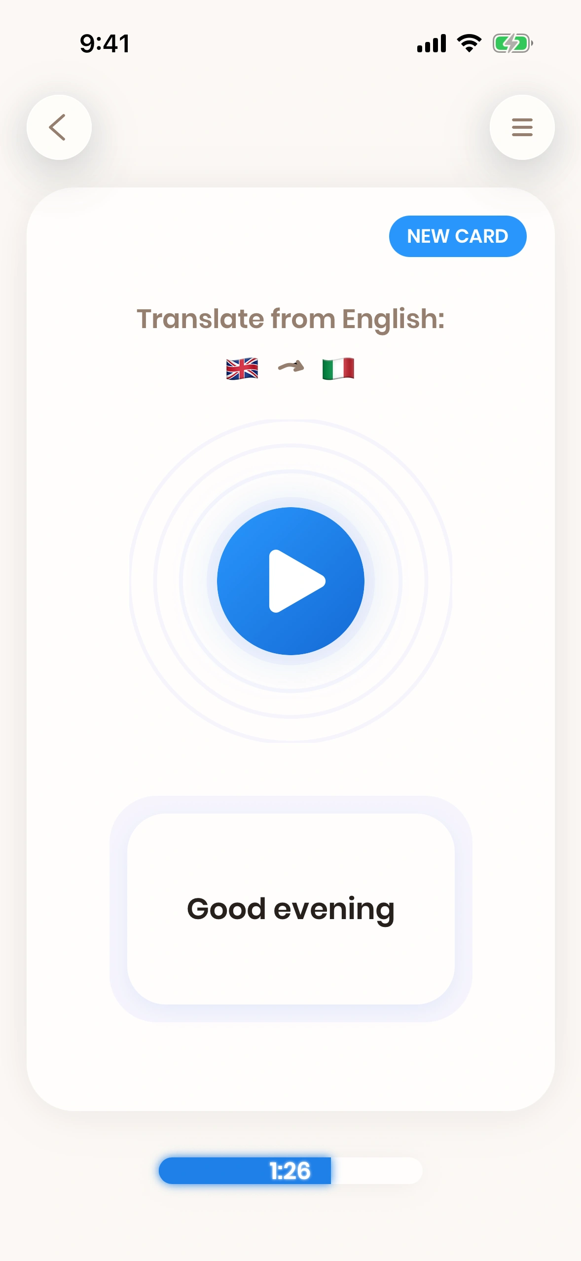 For this reason, the time progress indicator will go orange after a few seconds have gone by. This tells you that you should practice this card more often - which can be achieved by grading this card as hard or too hard and then move on to the next card.
