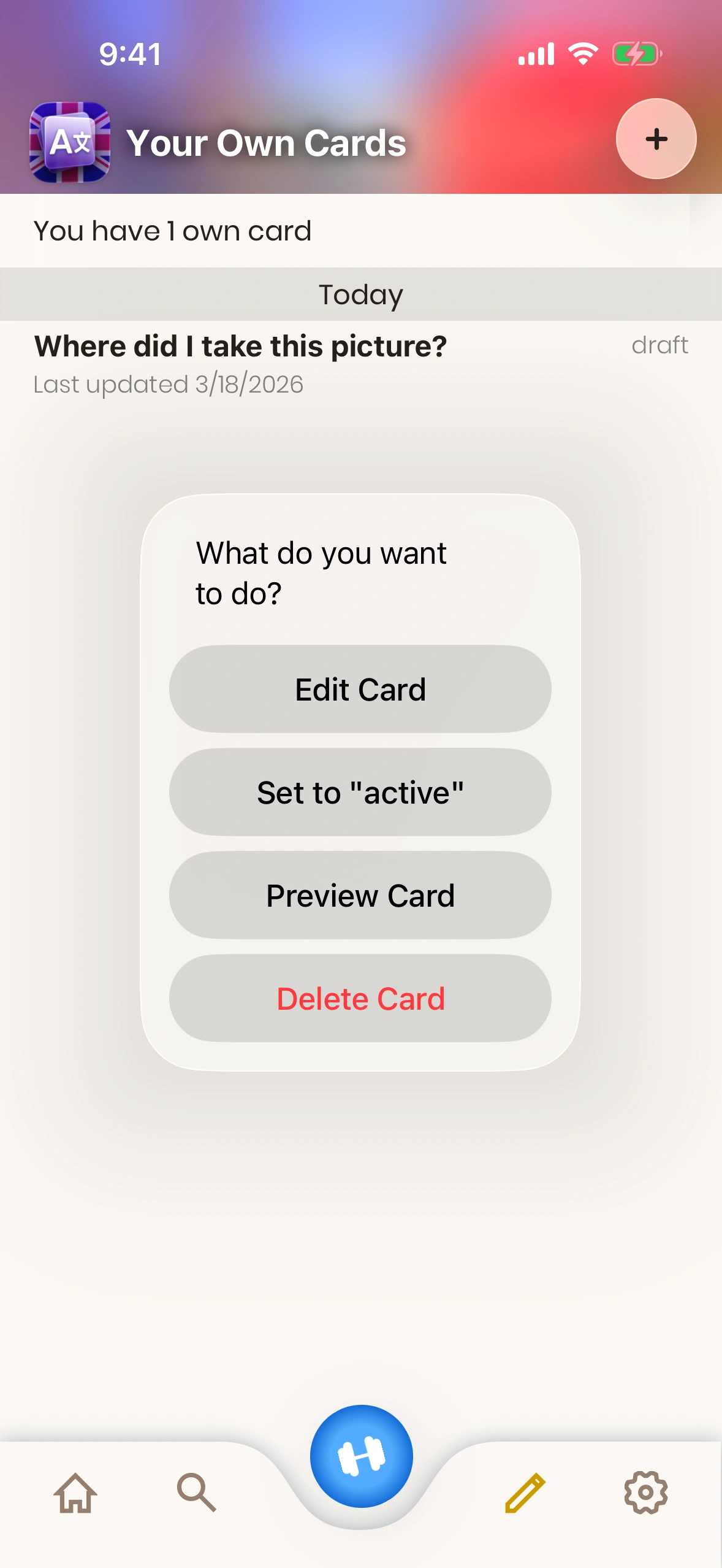 - Card Status: An Own Card is either in "draft" mode or "active". Draft cards are not shown while learning. To change the status of a card, tap it.