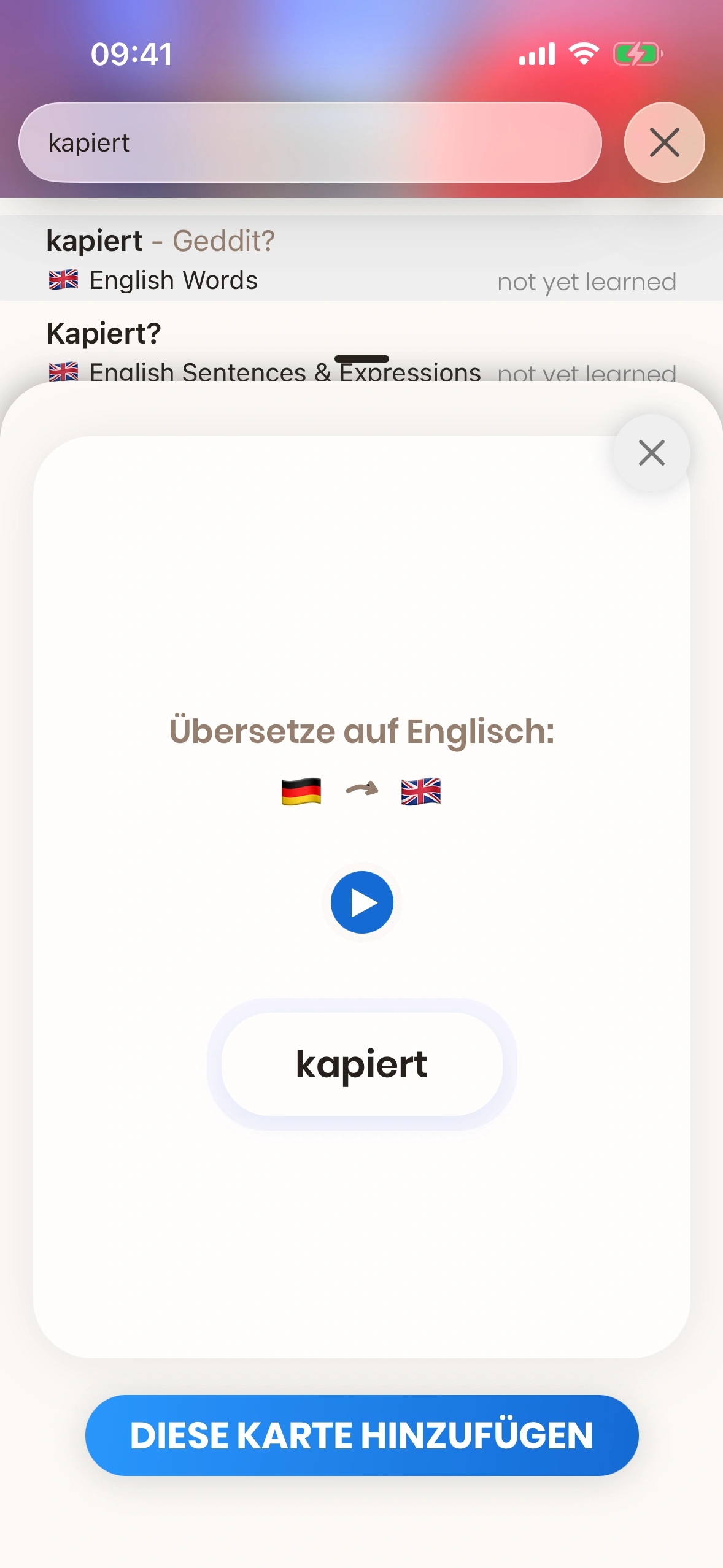 Wenn du die Übersetzung eines Wortes nicht kennst, schlage es im Wörterbuch nach und füge die Karte über „ADD THIS CARD“ hinzu.