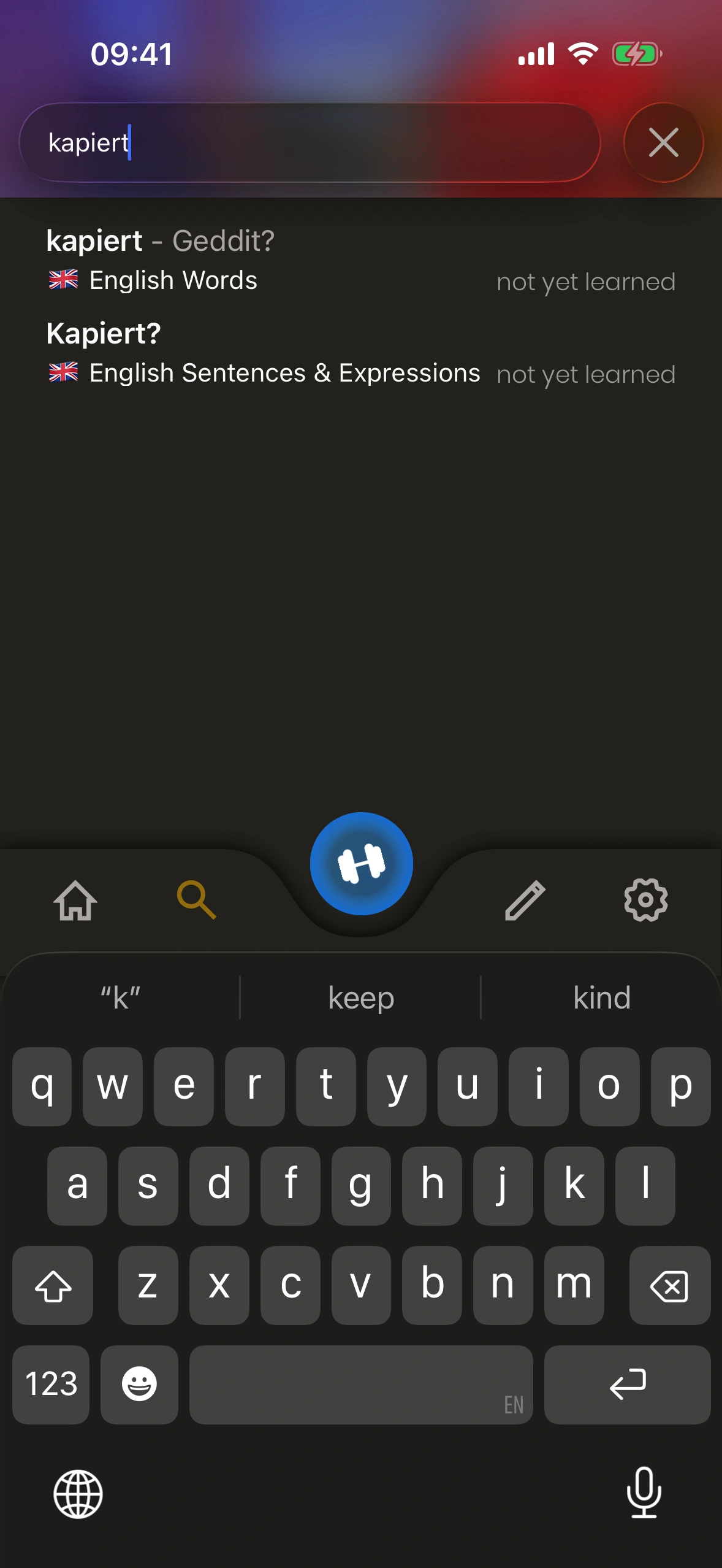 Just English bietet ein vollwertiges Wörterbuch – jeder Eintrag ist eine Karte, die du zu deiner Lern‑Warteschlange hinzufügen kannst!