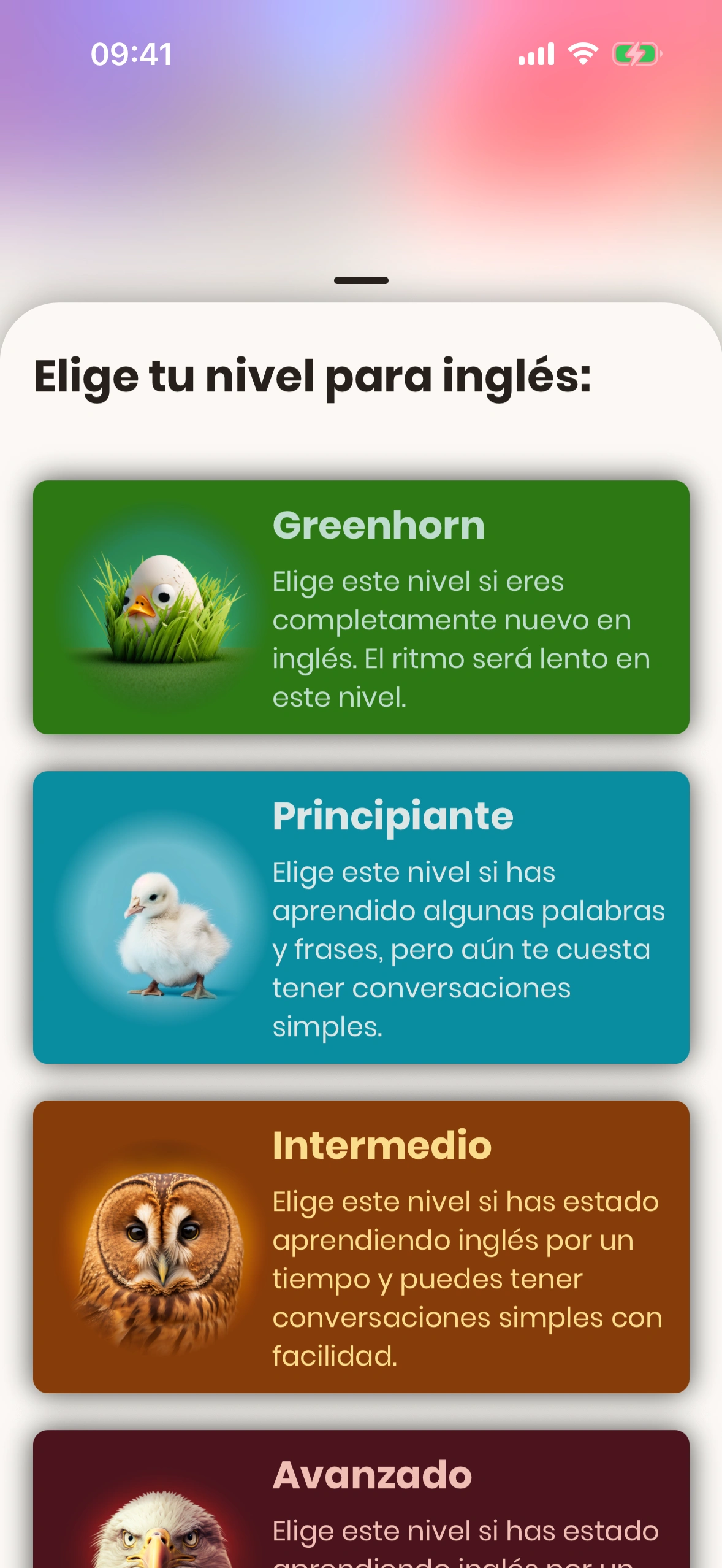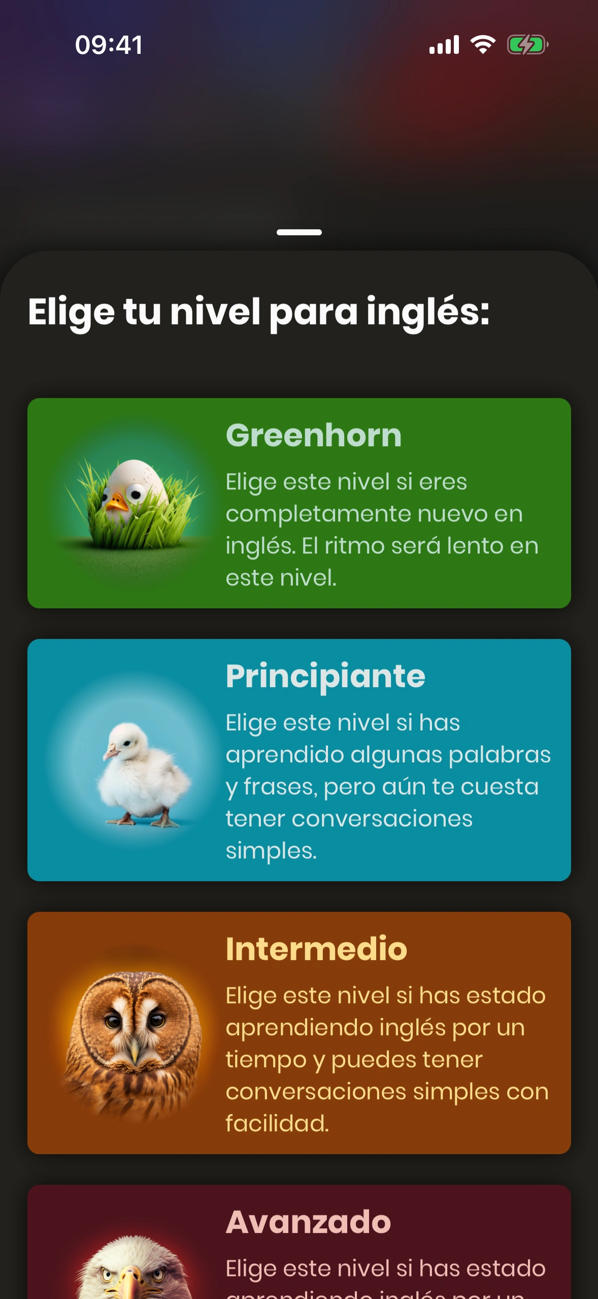 En el tutorial al primer inicio, Just English evalúa tus habilidades y te sugiere un nivel. Recomendamos aceptar la sugerencia — pero puedes cambiarla en cualquier momento.