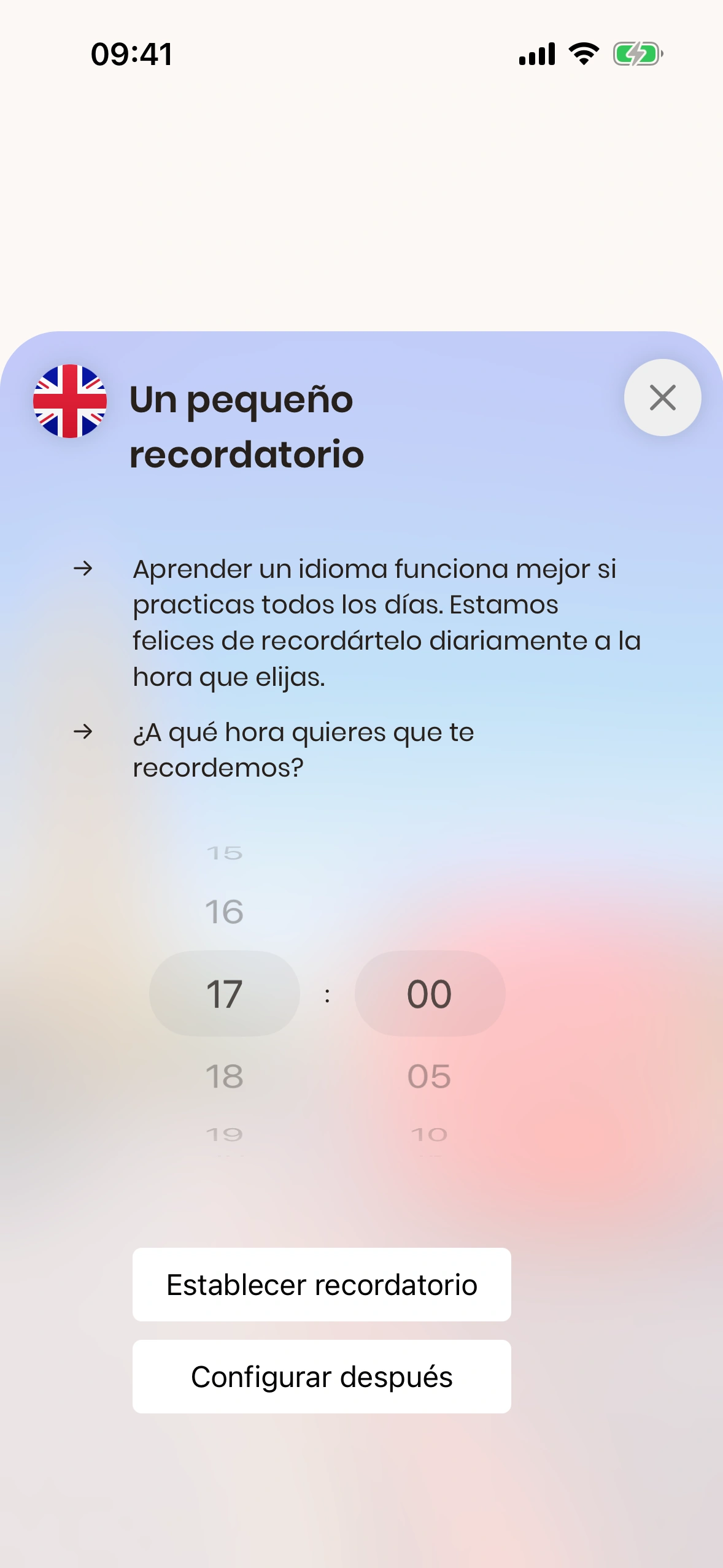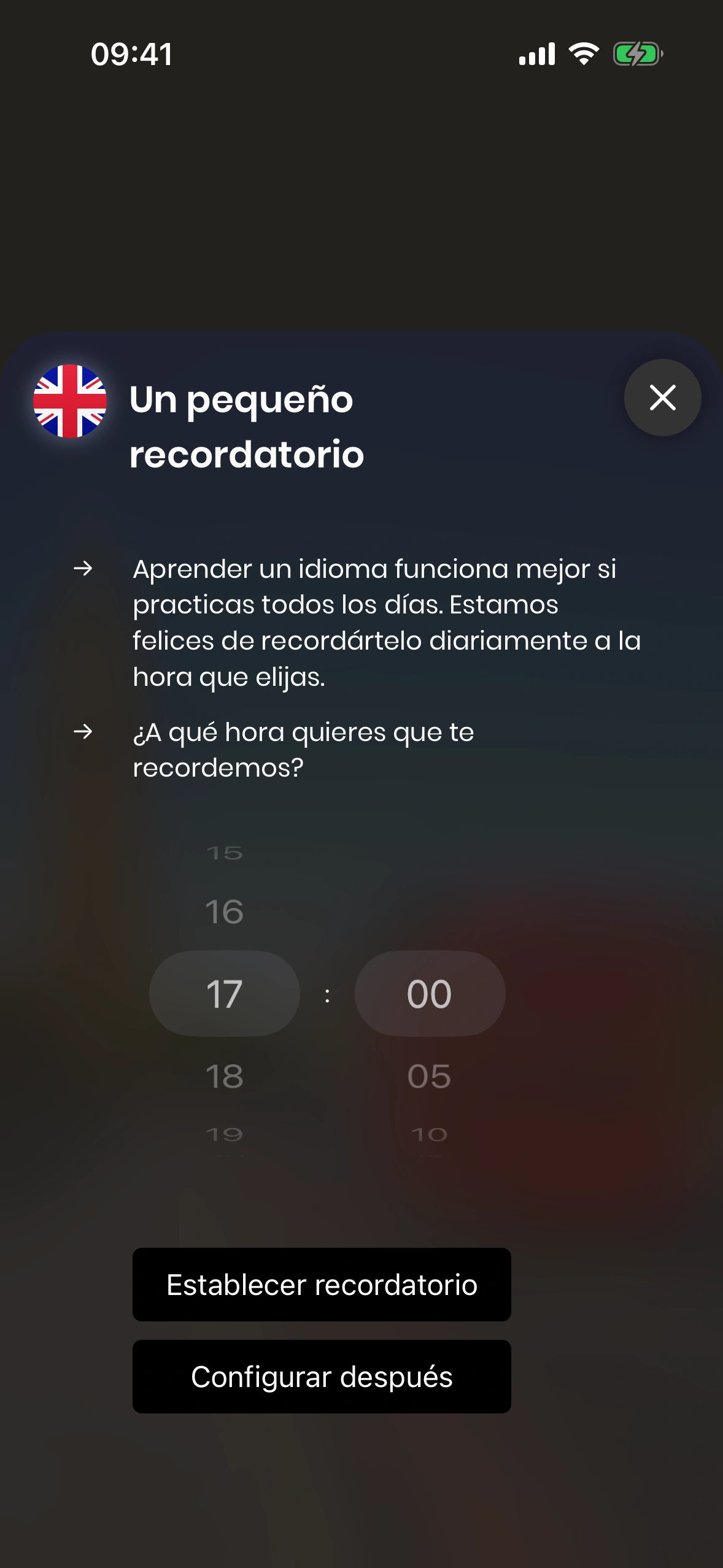 • En el día a día con trabajo, familia y amigos, es fácil olvidarse de la lección diaria. Por eso Just English ofrece recordatorios diarios. Puedes activarlos tanto en el tutorial como en los ajustes.