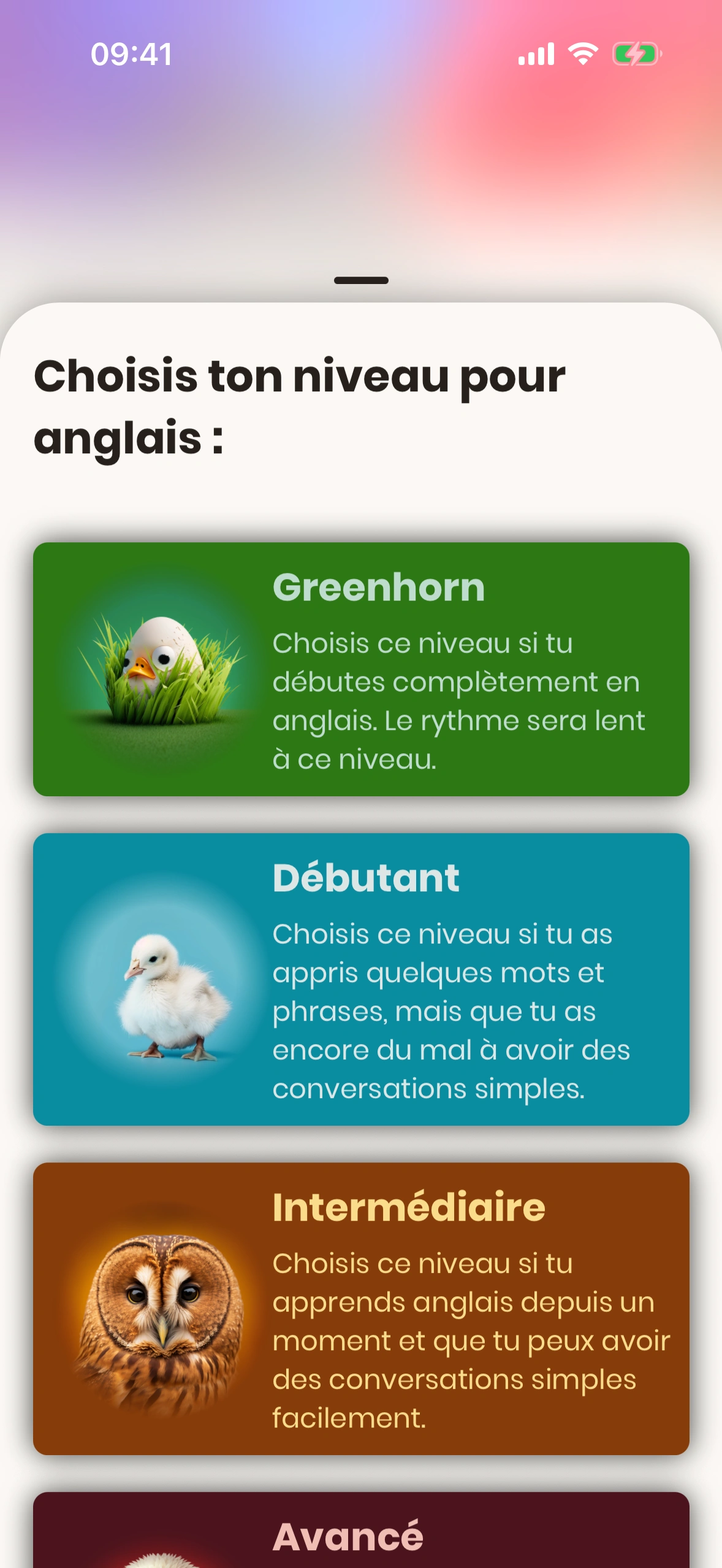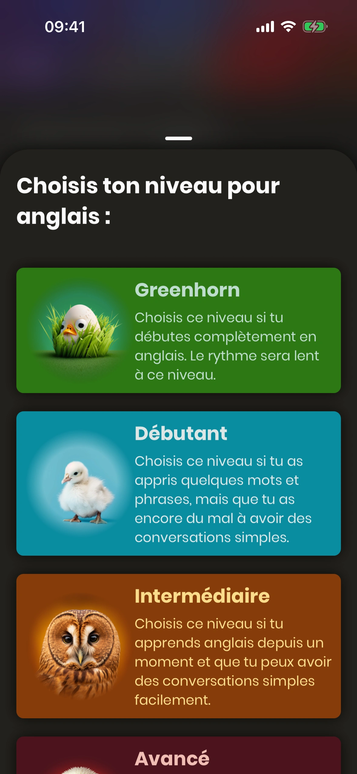 Dans le tutoriel au premier démarrage, Just English évalue tes compétences et te propose un niveau. Nous recommandons d'accepter la suggestion – mais tu peux la modifier à tout moment.