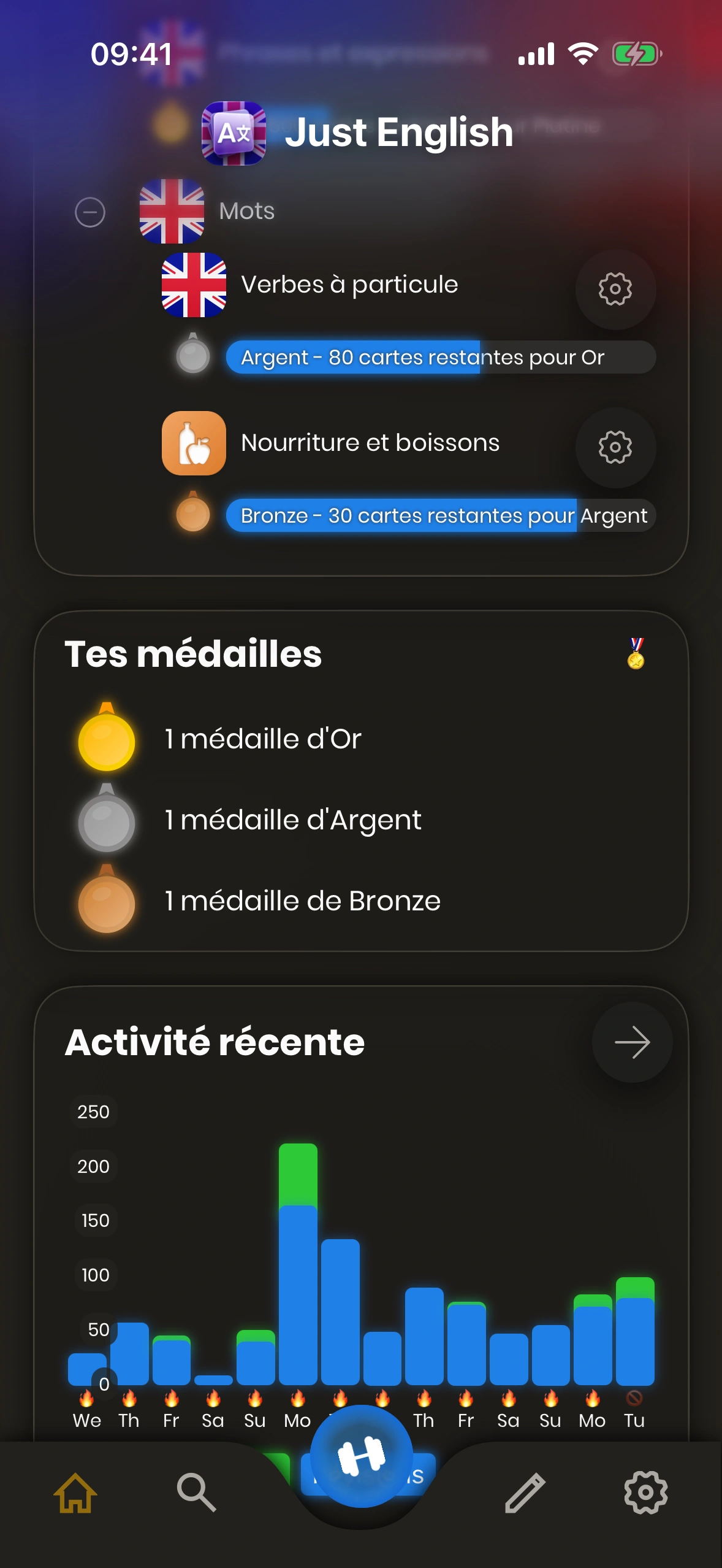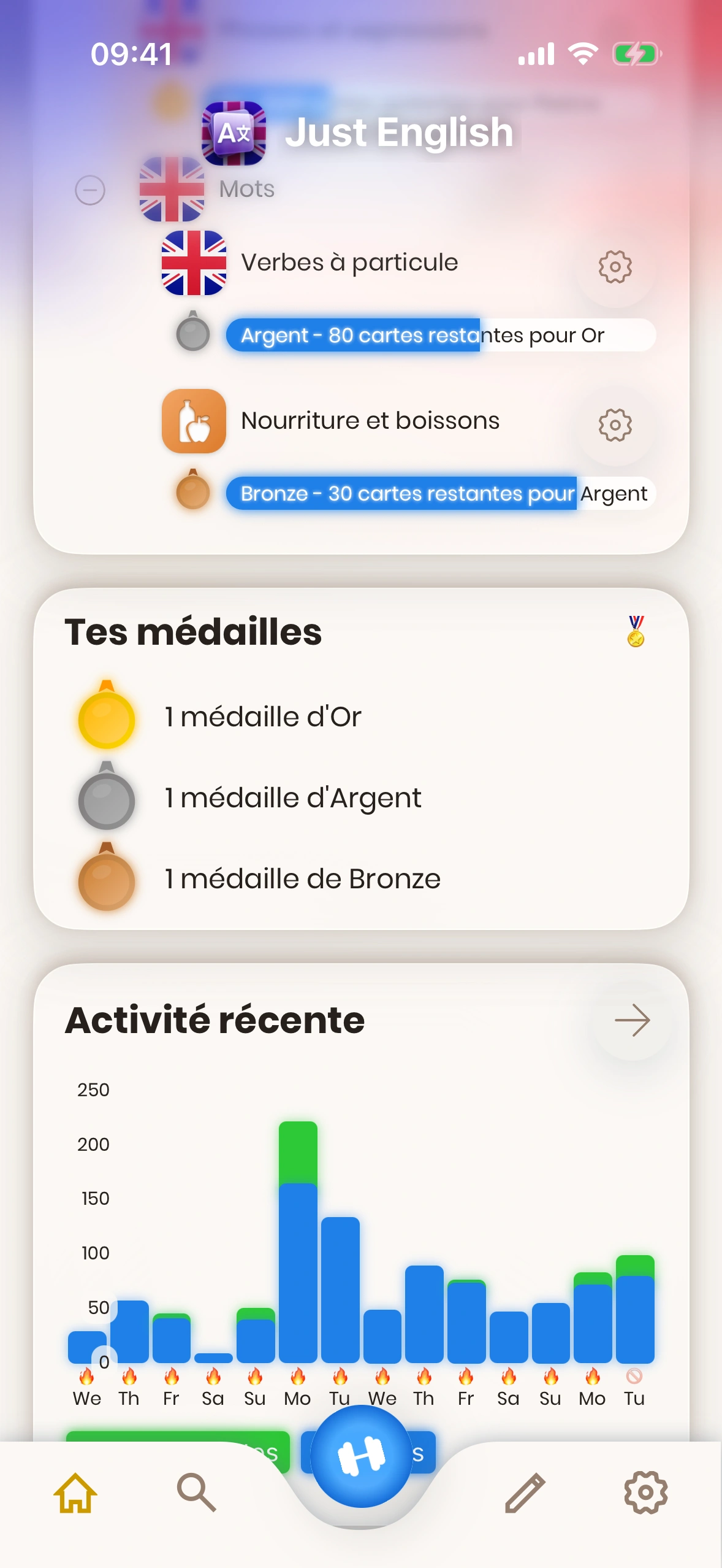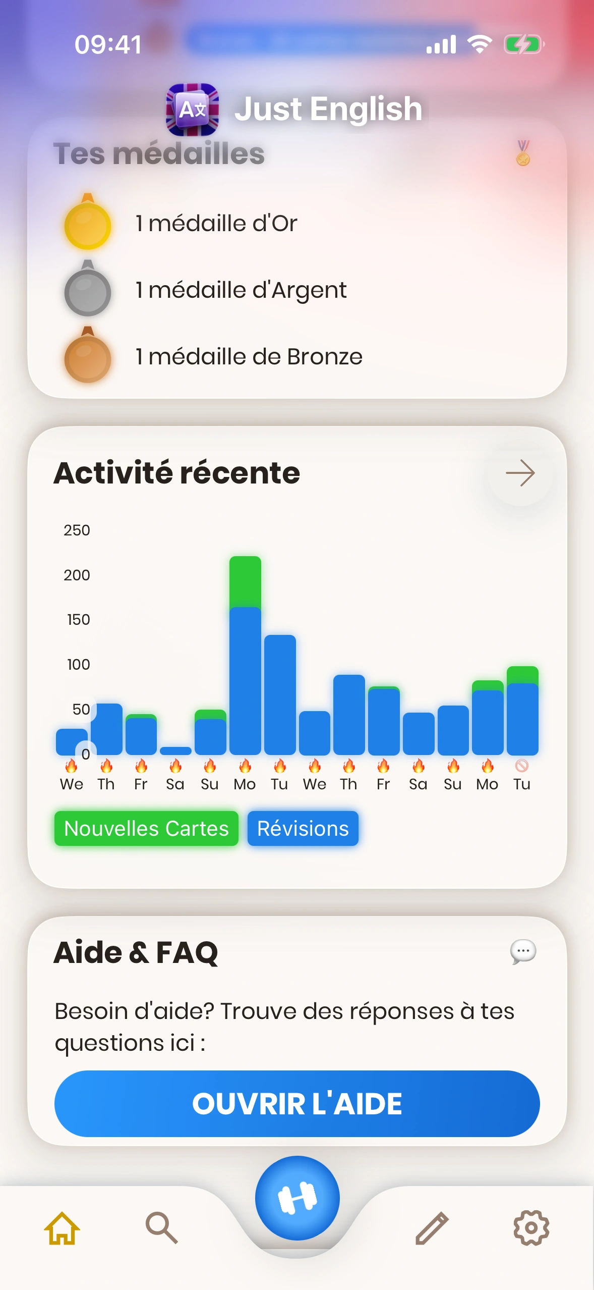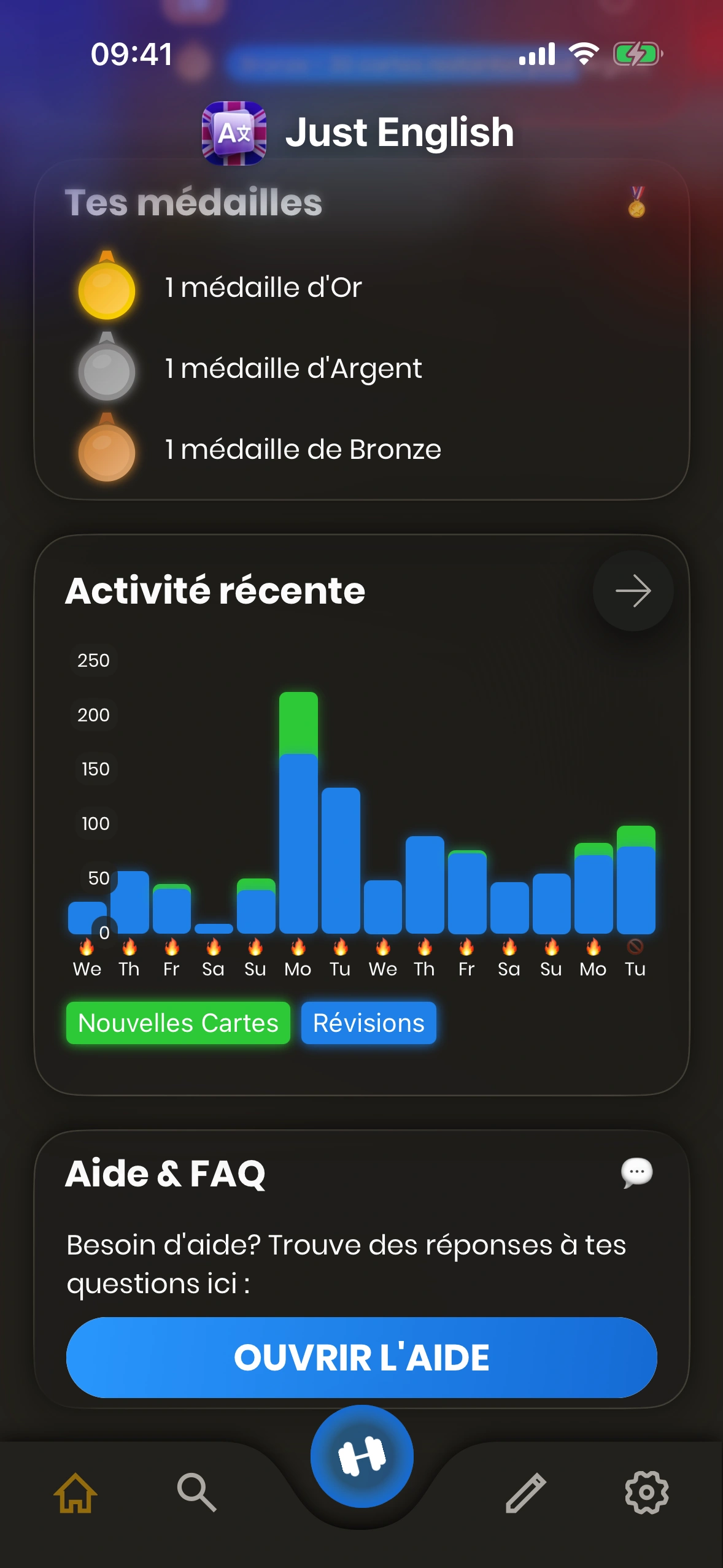 - Activité : Tes activités des derniers jours. Les révisions en bleu, les nouvelles cartes en vert. Les jours avec 🔥 sont des jours de série (objectif quotidien atteint). Via la flèche tu vois les détails de l'historique.