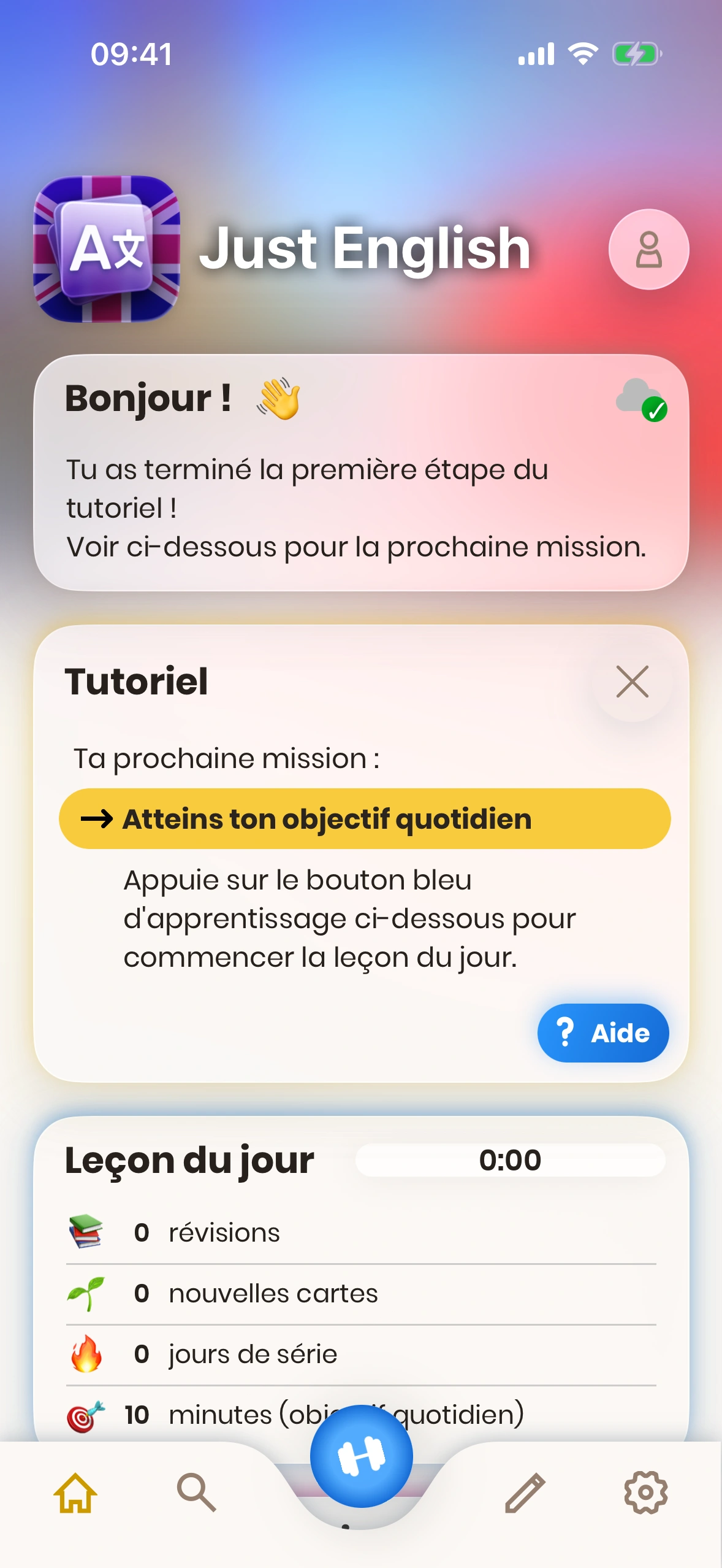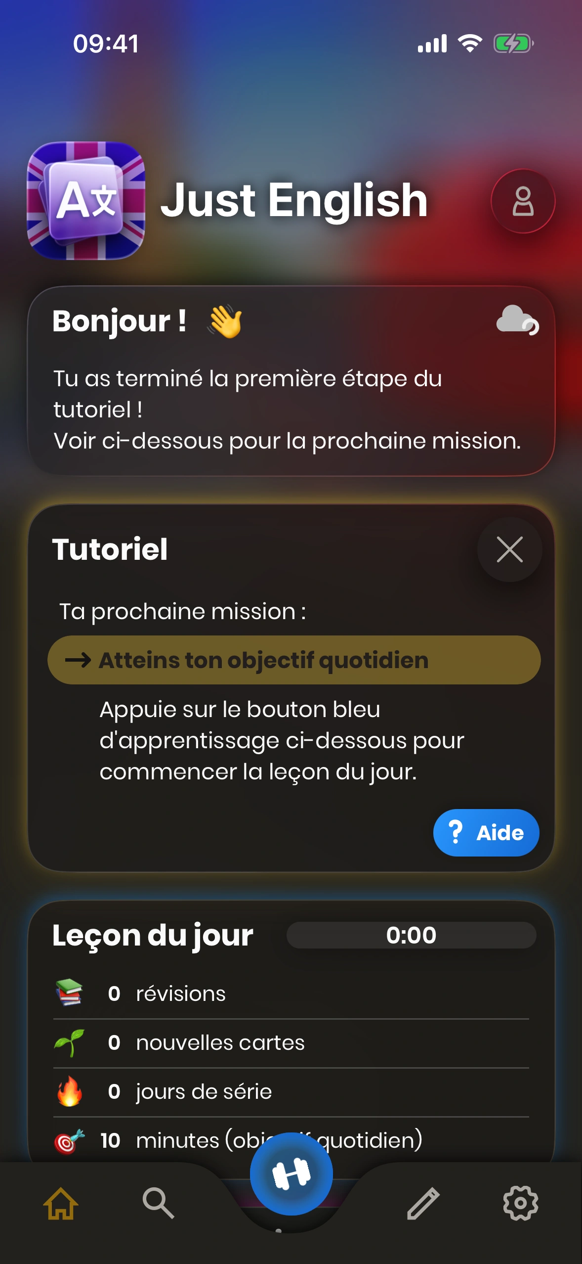 Après le tutoriel ou après la connexion, tu arrives sur l'écran d'accueil au démarrage de Just English.