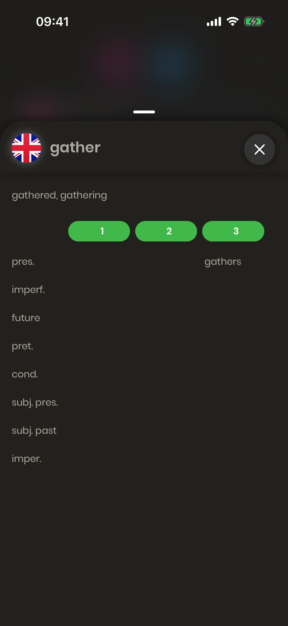 La fenêtre modale de conjugaison affiche un tableau de conjugaison verbale. Elle peut être affichée pour tous les verbes en Anglais. Appuie sur le Bouton Ajouter d'un verbe, puis appuie sur « Tableau de conjugaison ».