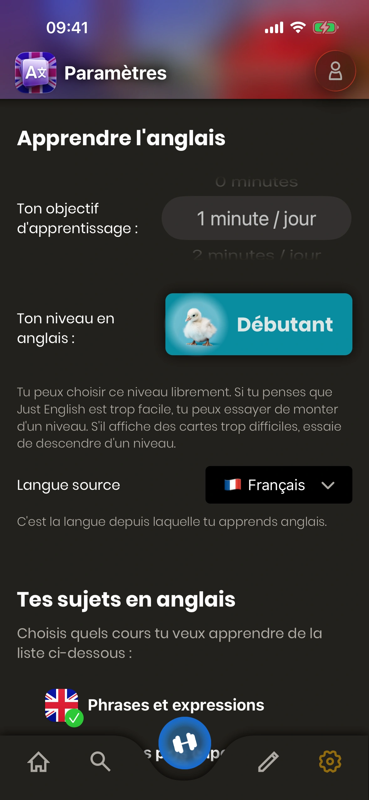Le nombre de minutes que tu veux apprendre chaque jour est l'ingrédient le plus important pour une progression rapide. Évidemment, plus tu apprends, plus tu progresseras vite. Tu peux définir ton objectif quotidien dans les paramètres.