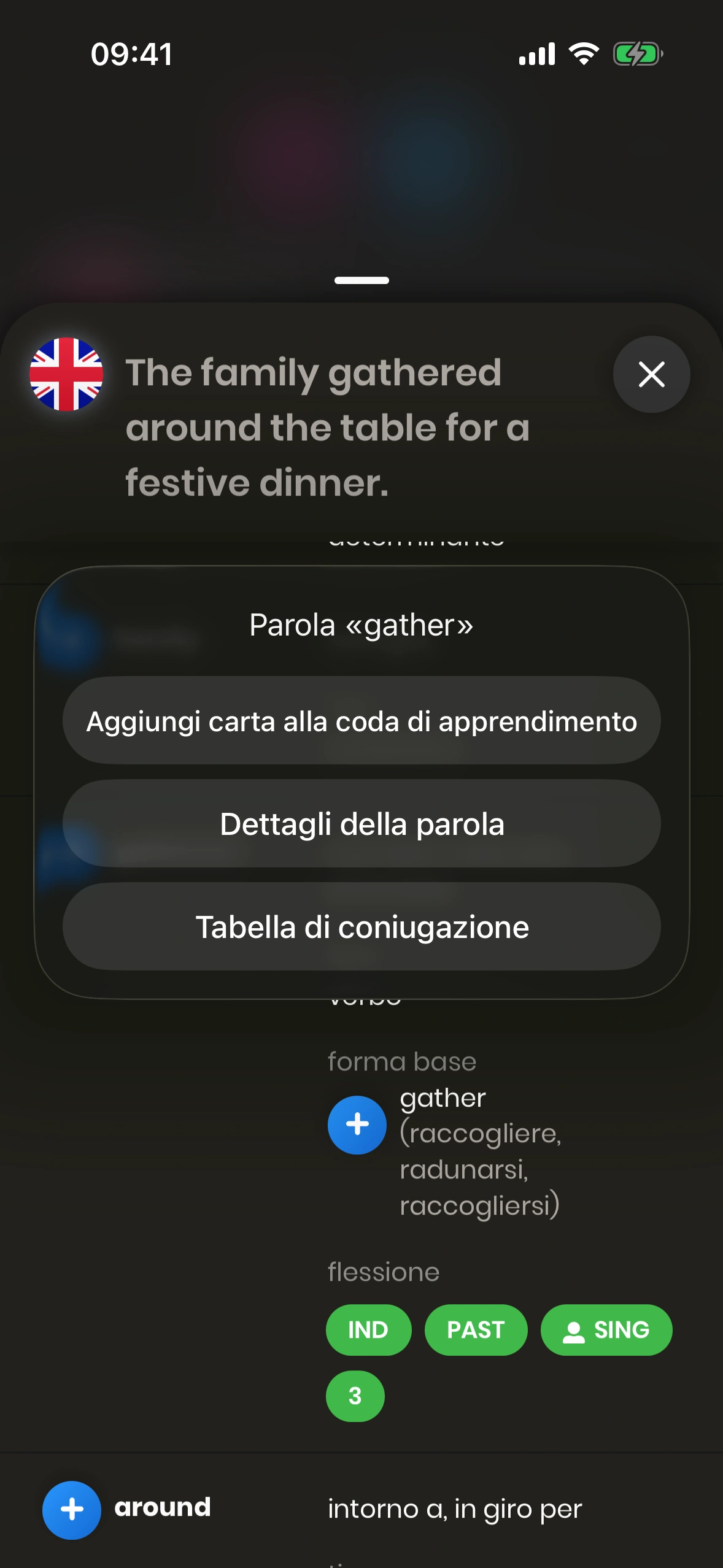 • Aggiungi carta alla coda di apprendimento: Aggiunge la parola selezionata come carta separata alla tua coda di apprendimento.