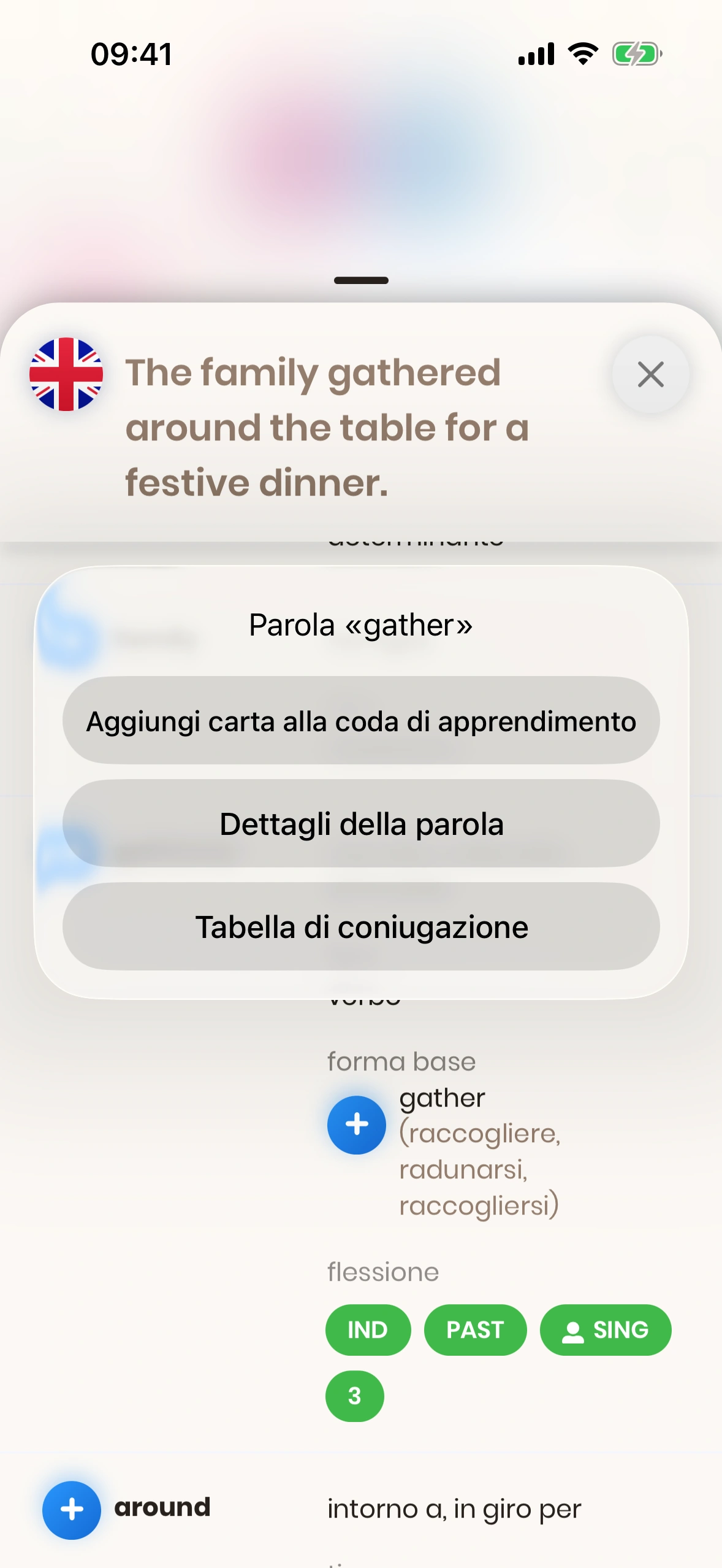 Se incontri una frase di esempio che vorresti esercitare specificamente, queste frasi possono essere aggiunte come carte di apprendimento separate. Basta toccare il pulsante (+) a destra di una frase di esempio.