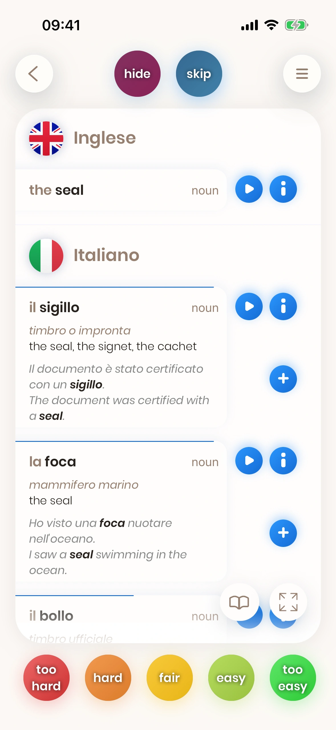 Può essere difficile ricordare distinzioni così sottili, ma con Just English puoi esercitarle nel contesto. Il modo più semplice per non dimenticare mai cosa significa "seal" in inglese è aggiungere quelle frasi di esempio alla tua coda di apprendimento.