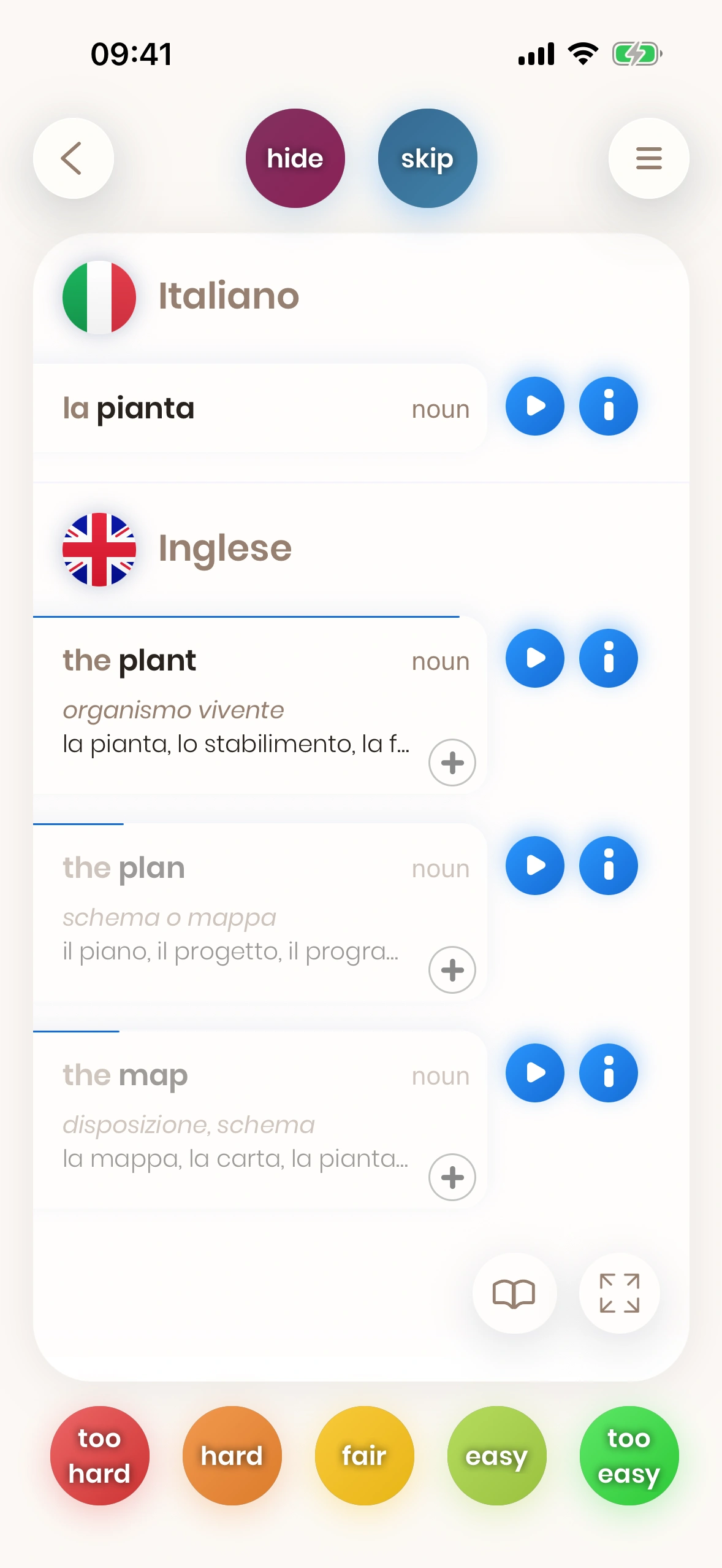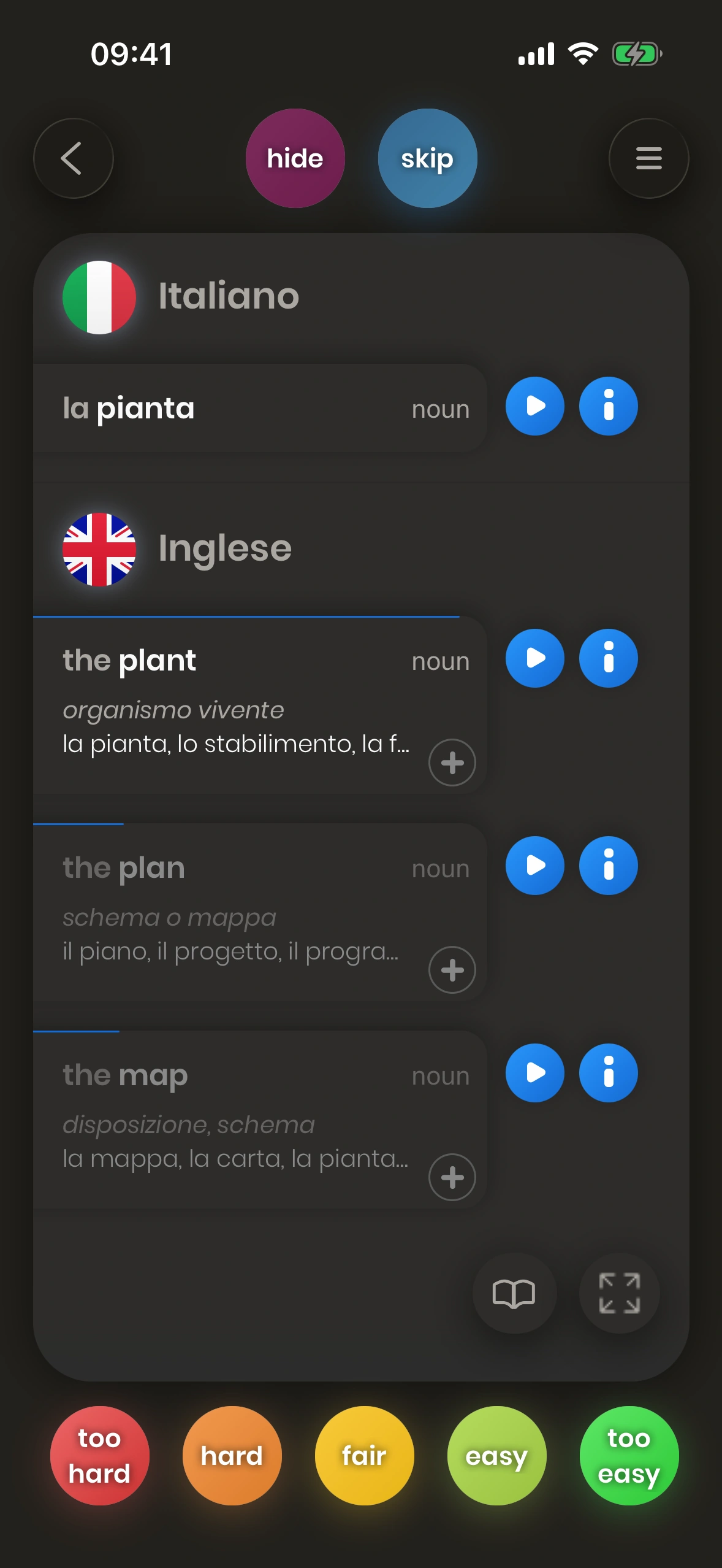Man mano che procedi in un corso di vocaboli, riceverai carte in entrambe le direzioni. Questo ti permette di allenare sia il vocabolario attivo che quello passivo.