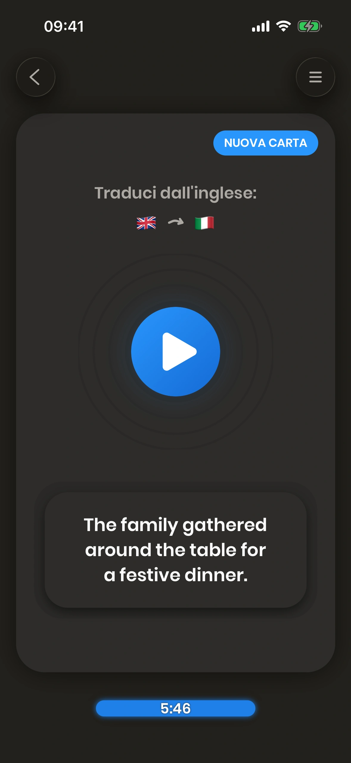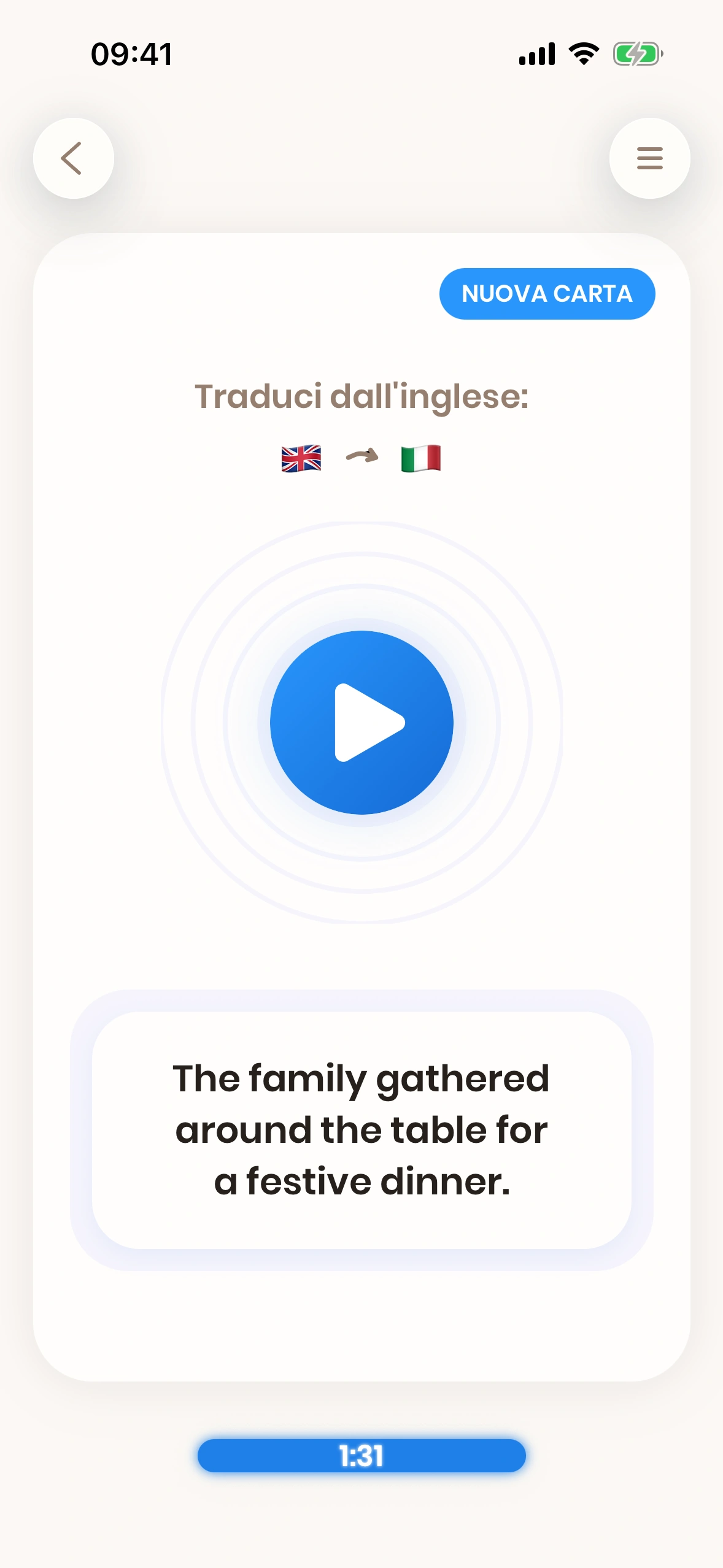 Just English è stato ottimizzato per un apprendimento rapido. Naturalmente puoi prenderti tutto il tempo che vuoi, ma il modo più efficiente per imparare è scorrere le carte in modo abbastanza veloce. Puoi leggere di più su questo qui.