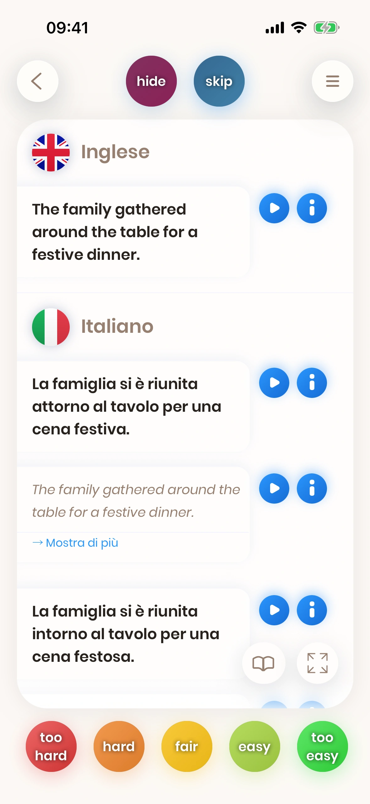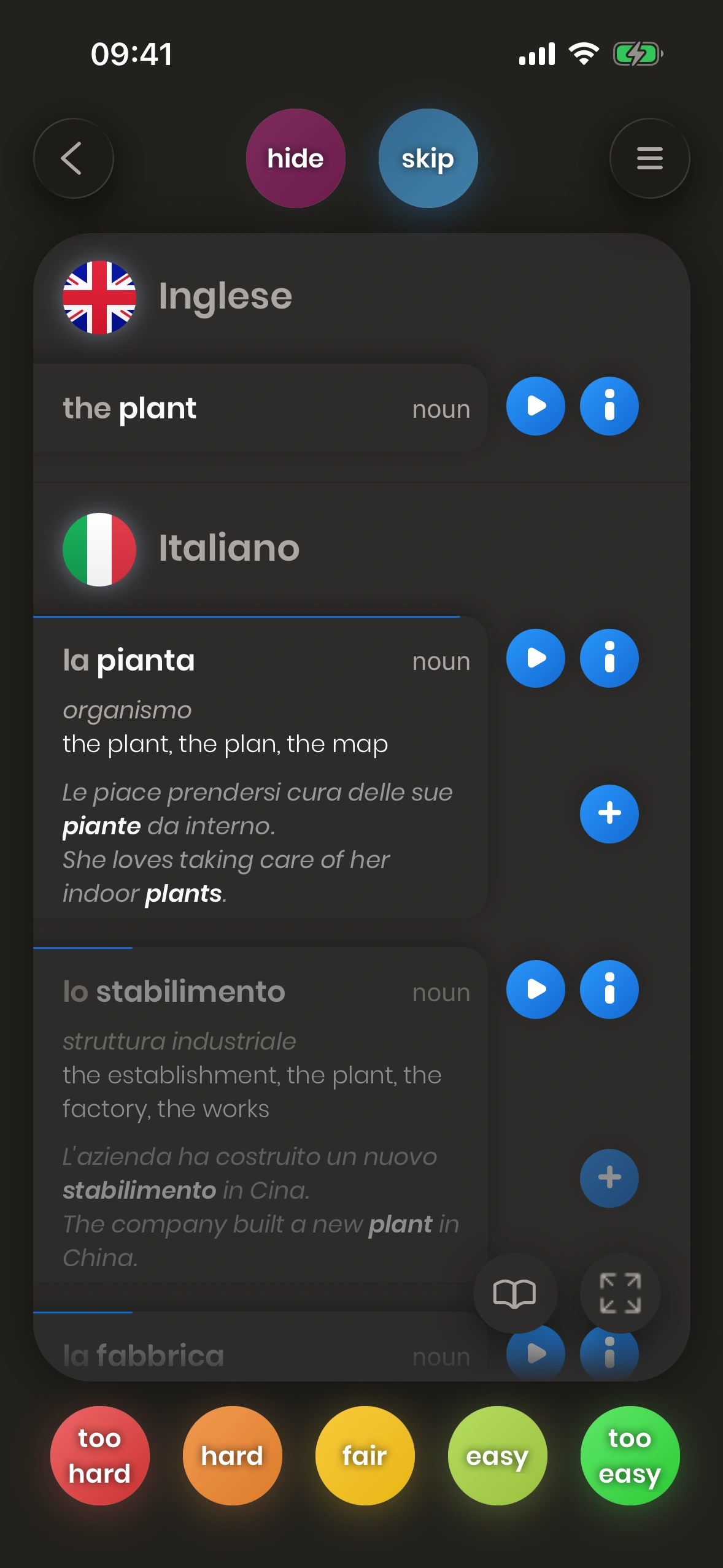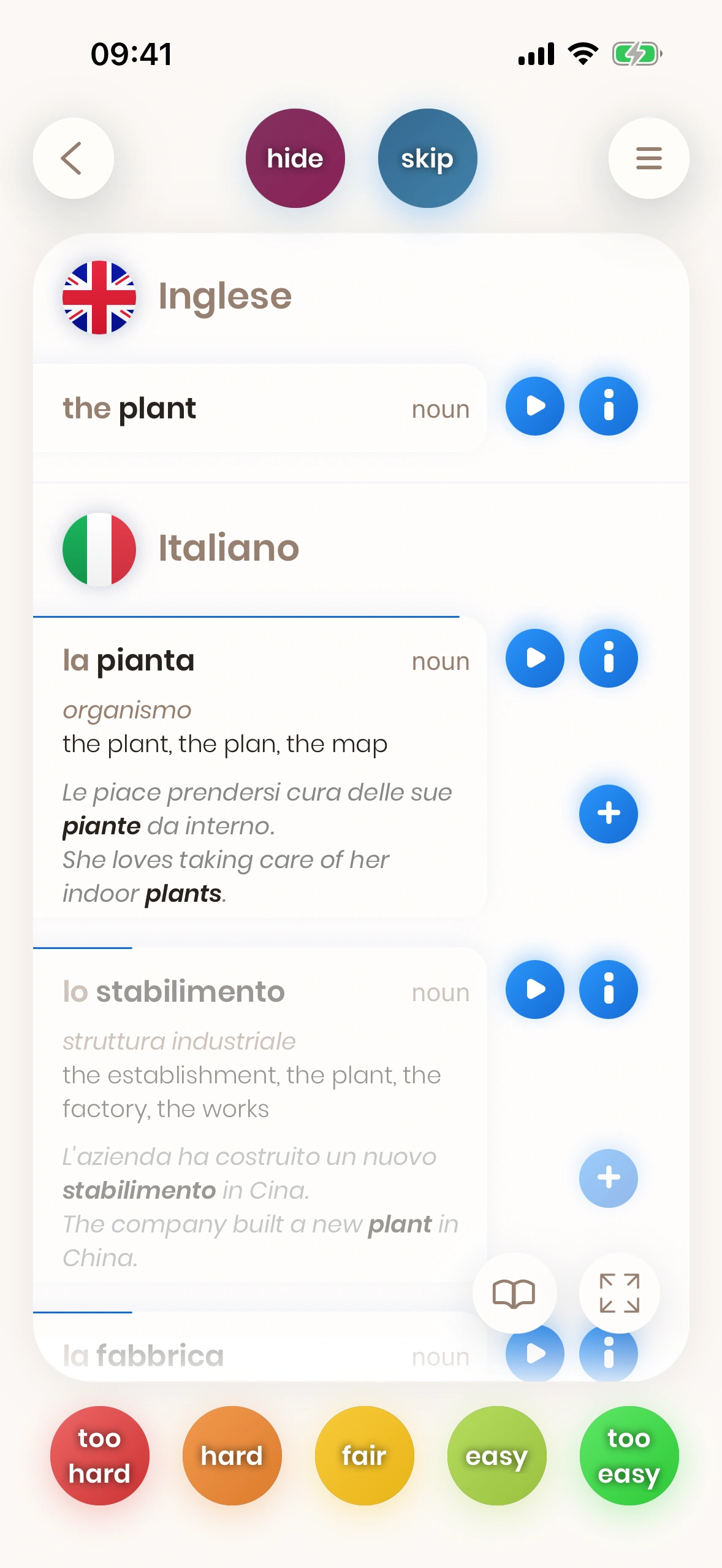 6. A seconda che tu abbia "saputo" la traduzione o meno, valuti la carta hard o easy (vedi il capitolo successivo per i dettagli).