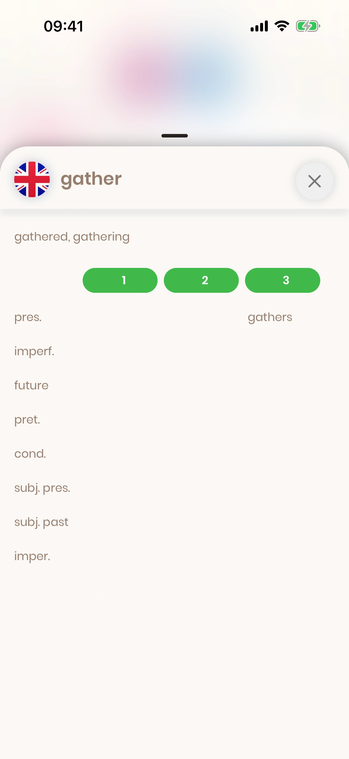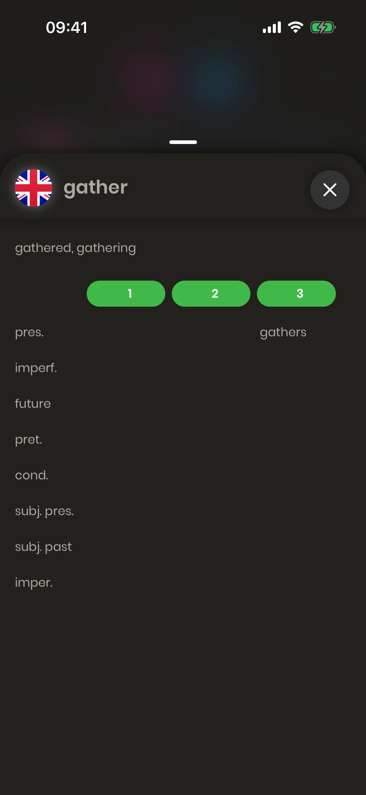 Il modale di coniugazione mostra una tabella di coniugazione verbale. Può essere visualizzato per tutti i verbi Inglese. Tocca il Pulsante Aggiungi di un verbo, quindi tocca "Tabella di coniugazione".
